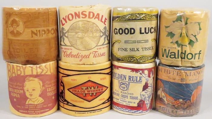 Collection of Vintage Toilet Tissue Rolls. Nippon, Good Luck Silk, Baby Tissue, Lyonsdale, White Manor, Trade Winner, Waldorf and Golden Rule.