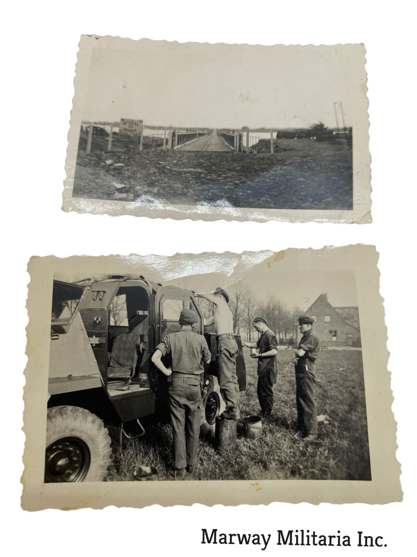 Approx 70 in this lot. WW2 era pictures. All with "Passed by 1 CDN Army Photographic Processing Unit". Many interesting pictures. Some with written notes on back, such as "a pile of German mines where one chap lost his leg". Many bridge pictures, and vehicle pictures. One with a sign "CL 40 MELVILLE BRIDGE"
