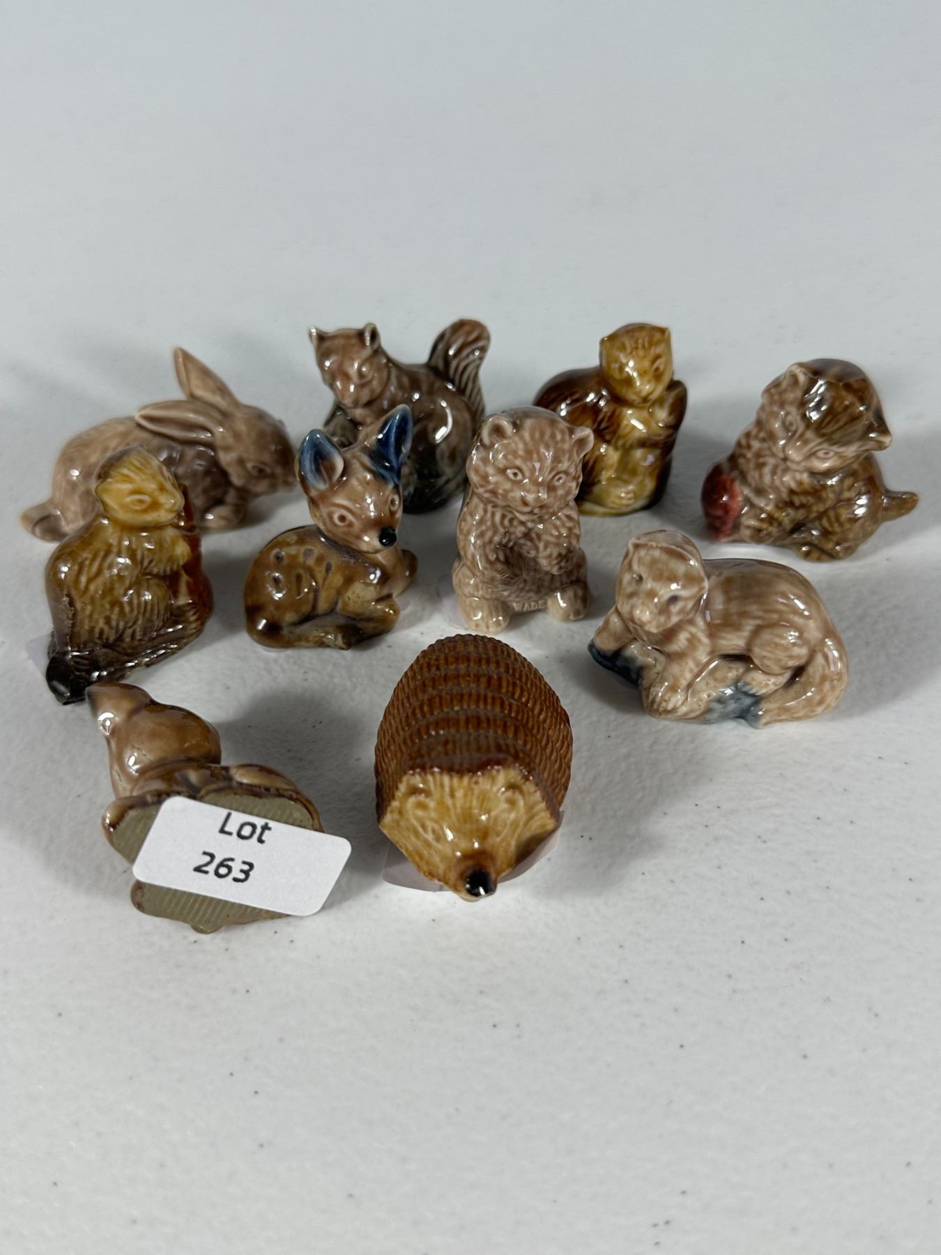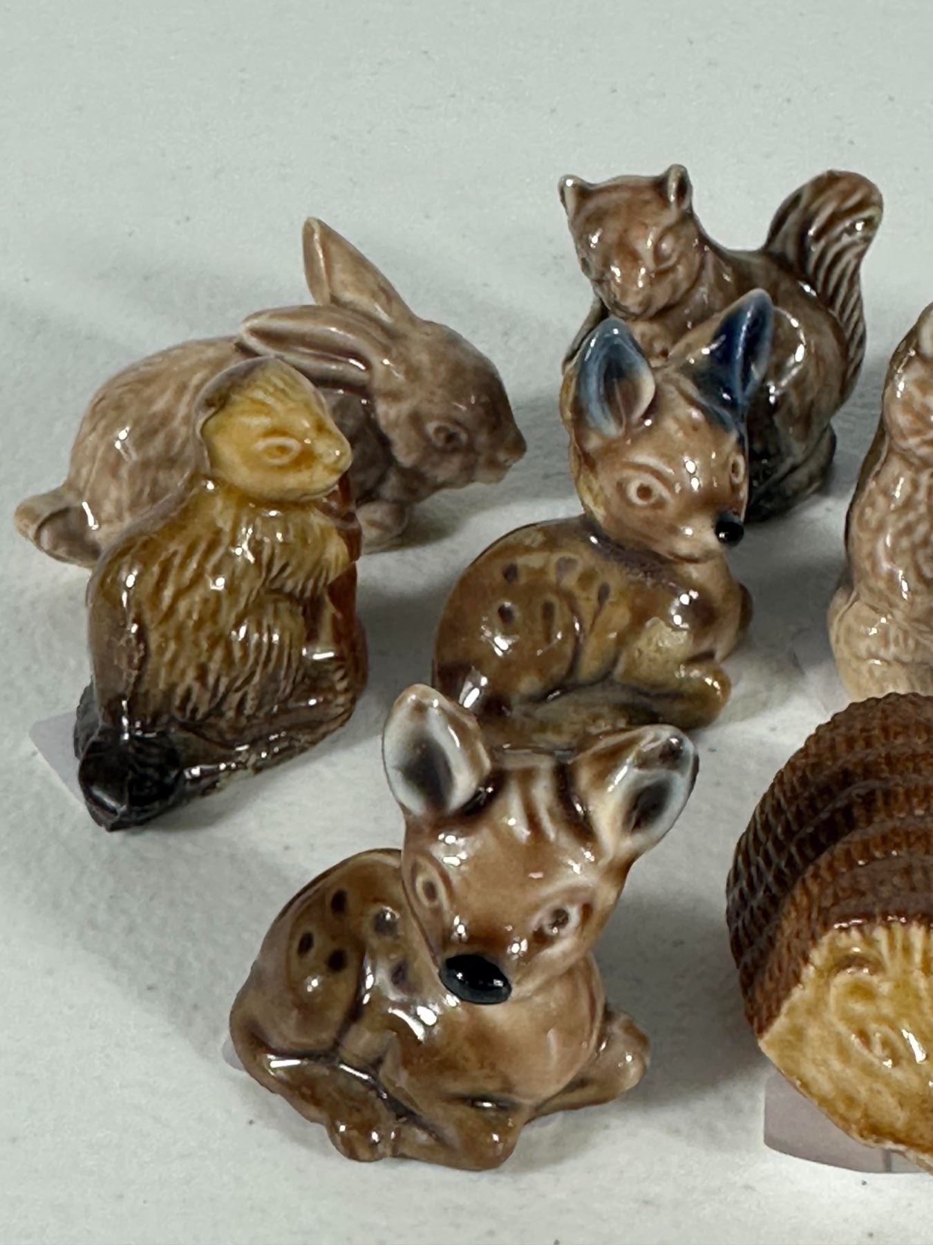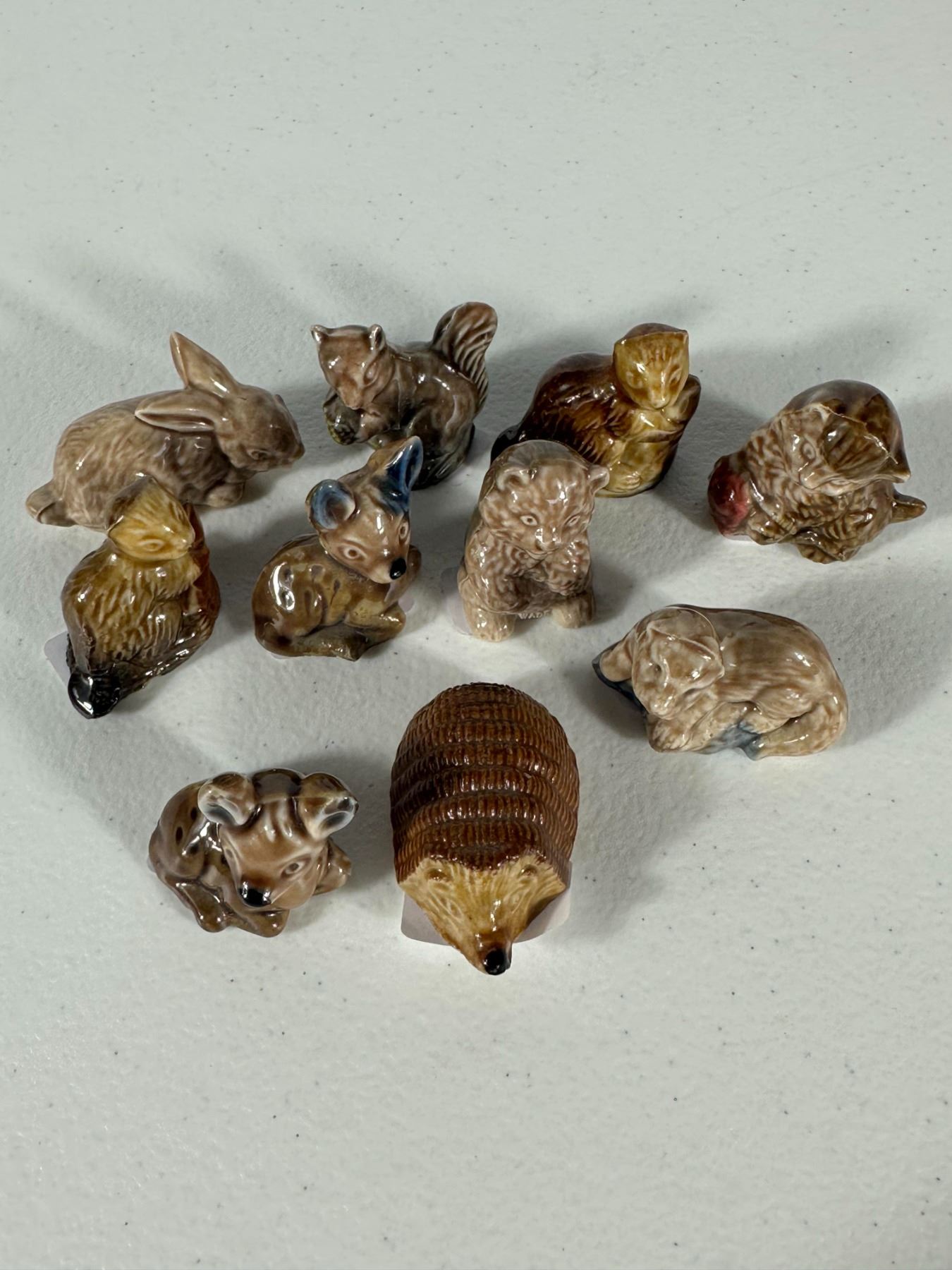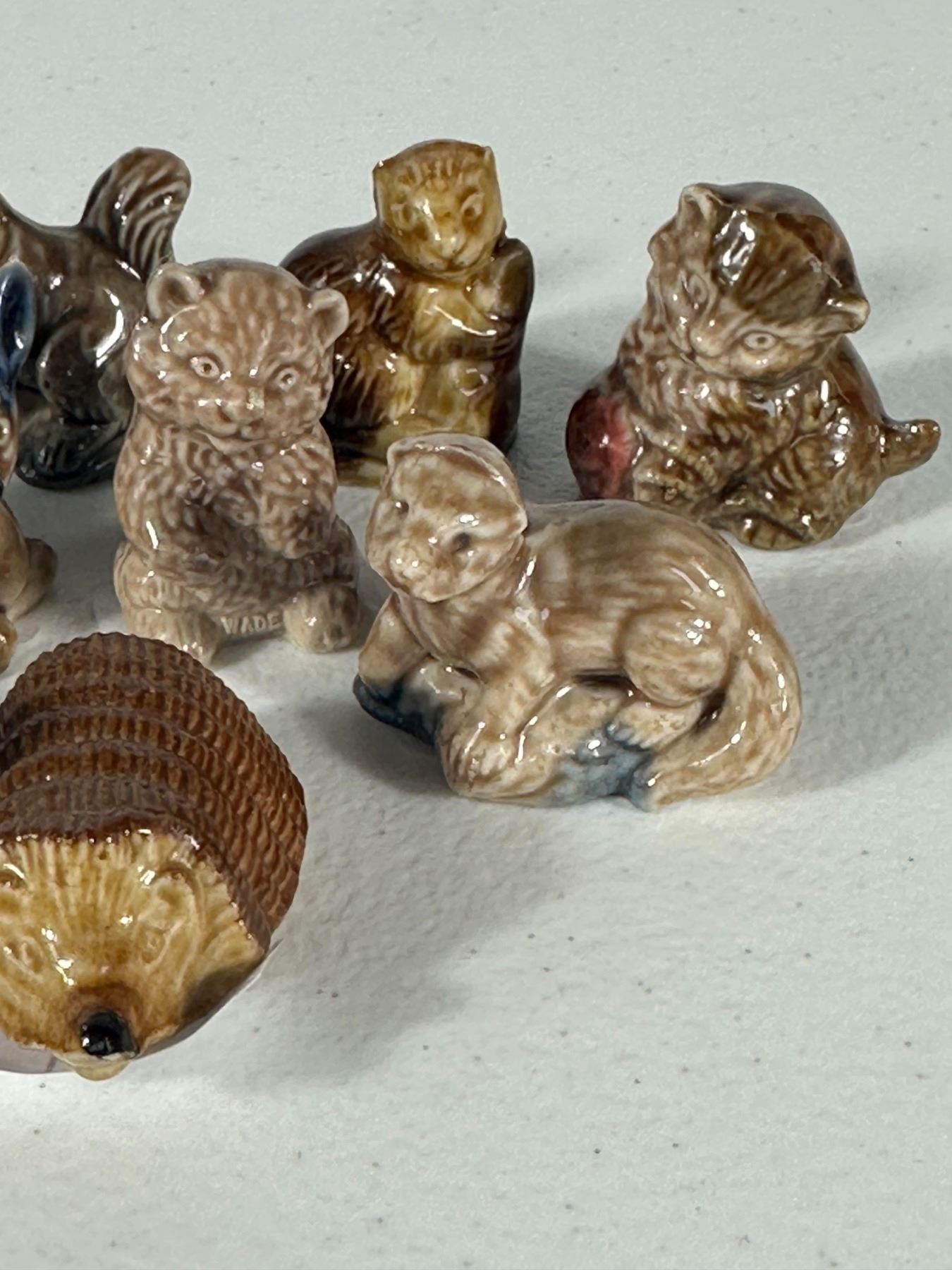 Group of vintage Wade Whimsies porcelain figurines featuring woodland animals including hedgehog, rabbit, fox, squirrel, and other small creatures. Hand-painted glazed porcelain miniatures, detailed and charming. Popular collectible series.