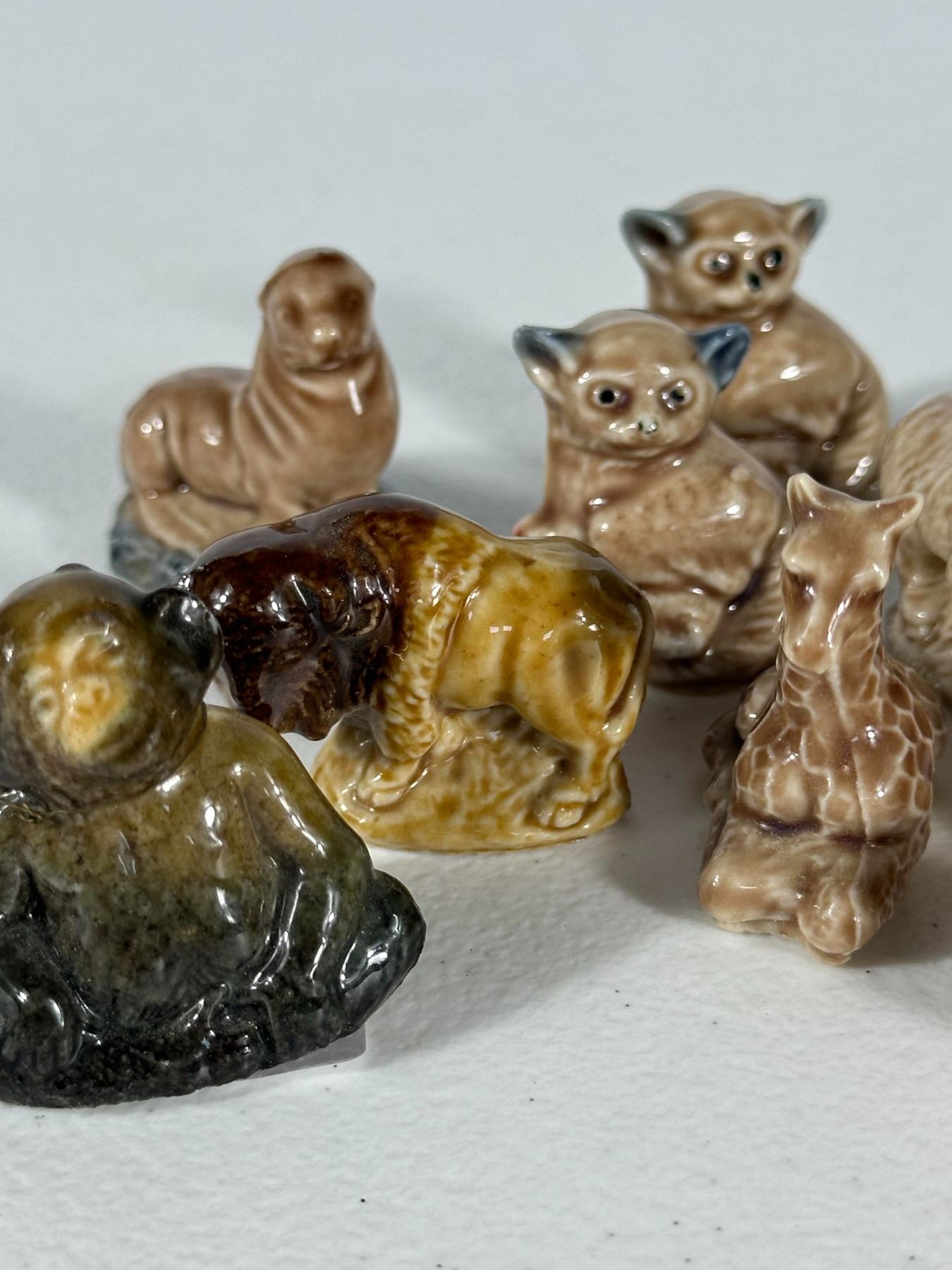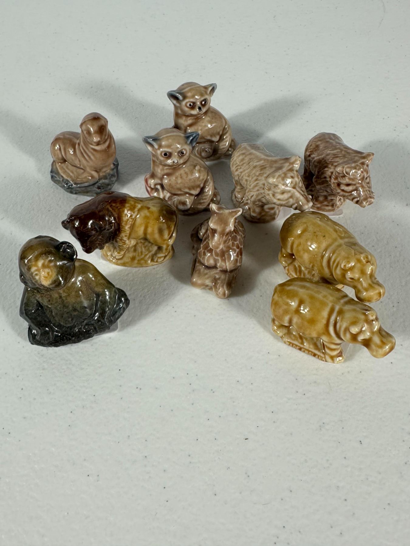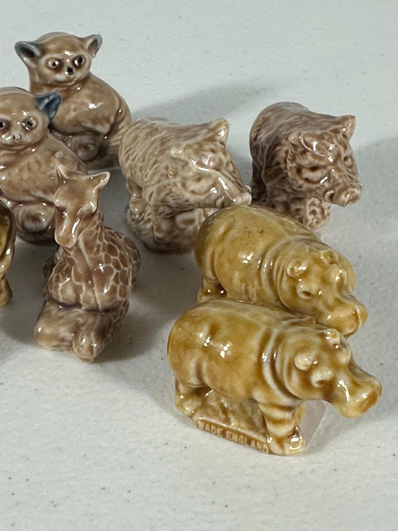 Group of vintage Wade Whimsies porcelain figurines featuring zoo and exotic animals including hippos, bison, seal, bear, monkey, giraffe, and others. Glazed porcelain miniatures with hand-painted details. Classic collectible Wade series.