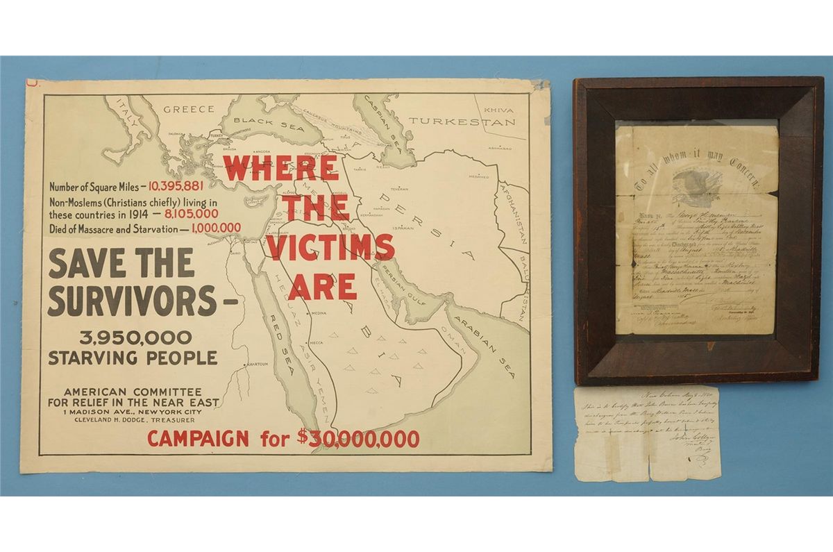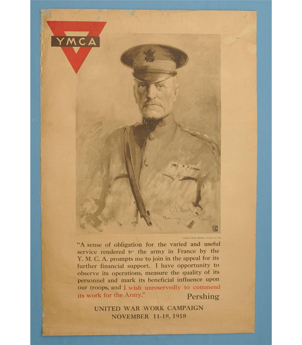 1) Letter of lawful discharge dated Aug 8, 1820. 2) 5 U.S. Army information posters from the 1950's including "RAID ON PLOESTI" and "FIRST AT VICKSBURG". 3) A framed military discharge certificate dated August 4, 1865. 4) WWI YMCA General Pershing poster that commends the work of the YMCA for the Army. Measures 32 1/2" x 21 1/2" and has been affixed to a linin backing. 5) " WHERE THE VICTIMS ARE" poster affixed to a linin backing measures 28" x 20". 6) The "RED TRIANGLE" poster affixed to a linin backing measures 40" x 27 1/2". 7) "MY SOLDIER" poster affixed to a linin backing measures 27 1/2" x 41". 8) "FOUR YEARS IN THE FIGHT" poster measuring 42" x 28". 9) "LEND the way the FIGHT" poster measures 41" x 27". 10) Large framed print of a charcoal titled "LE REVOIR" and marked "M. Rutin" with French dialog at the bottom. CONDITION: 1) Fair, the paper shows some tearing along the folds with tape repairs. 2) Very good. 3) Fair. 4) good with typical ageing and wear.5) good with typical ageing and wear.6) good with typical ageing and wear. 7) Fair. Some pieces are absent. 8) good with typical ageing and wear. 9) good with typical ageing and wear. 10) Very good.