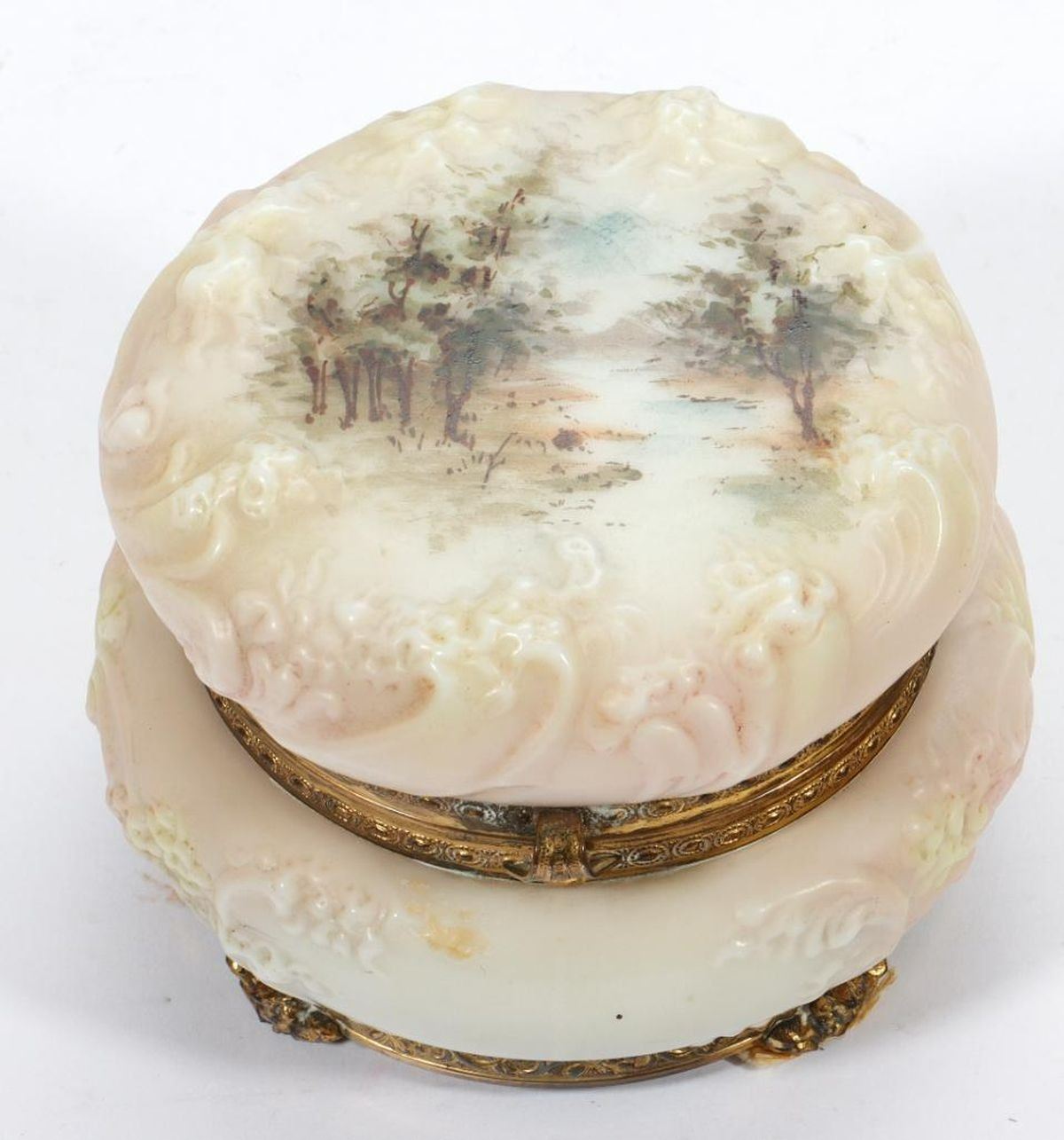 The molded glass and gilt metal items comprised of a pair of narrow-necked vases (eac. 7 1/2in. h.); an oblong dish (5 3/4in. l. x 2 1/12in. h.); and a hinged lidded jar with silk lining (4 1/2in. diam.). Together with an unmarked, painted milk glass hinged-lid dresser jar (3 1/2in. diam.). Condition: Good, no chips/cracks found; silk in the lidded jar is frayed.