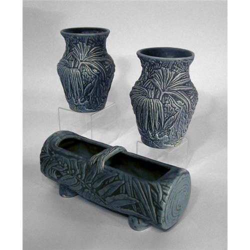 Description: Collection of Weller "Marvo" pottery. Two vases and a planter.