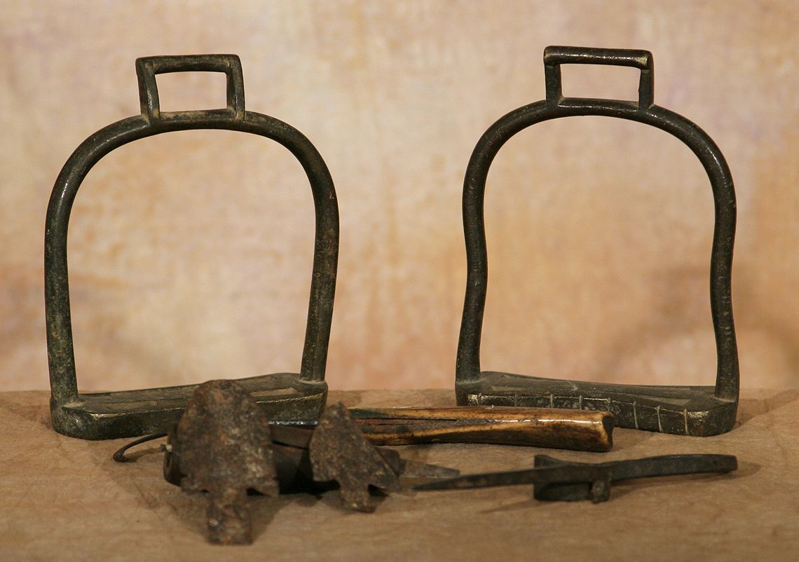 Collection Of Western Artifacts. Pair of metal stirrups, 7" x 5 ½" each. Miner's "Sticking Tommy" candleholder, 7 ½" forged from an iron spike. Two hand forged iron spear points, 4 ½" & 2 ¾" long. Leather tool with wood handle, 4 ¾" long. Antique hoof pick with bone handle, old label reads: Weston, Old Oregon Trail 1852, 8 ½" long. All 19th century. (est. $1,000-1,500). Provenance: The Ralph & Rowena Meyers Collection. CONDITION REPORTS: www.auctioninsantafe.com/docs/cr2012.pdf