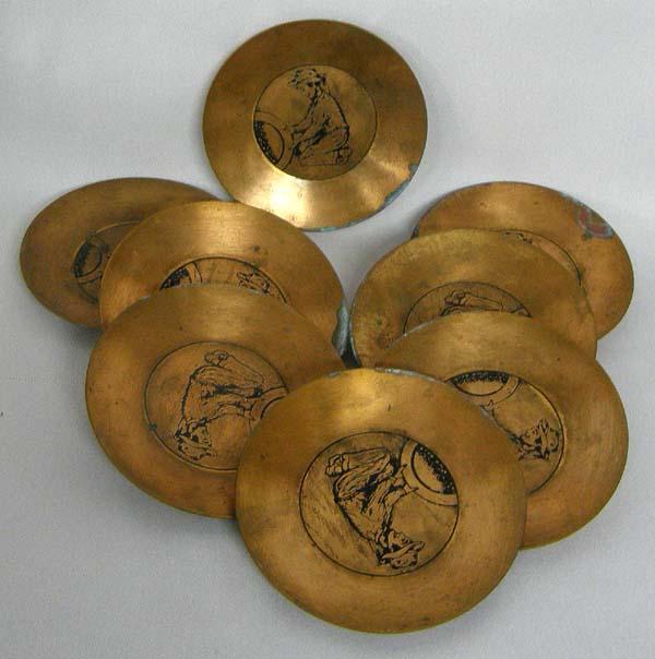 Collection of Western Mining Paraphernalia. Includes a brass scale weights (some missing), poke bag, mini copper mining pans, mining lamp and more. Lamp measures approx. 3.5''Hx3''W. Buyers Pay Actual Shipping and Handling Charges(see terms and conditions for more information).