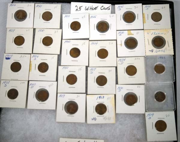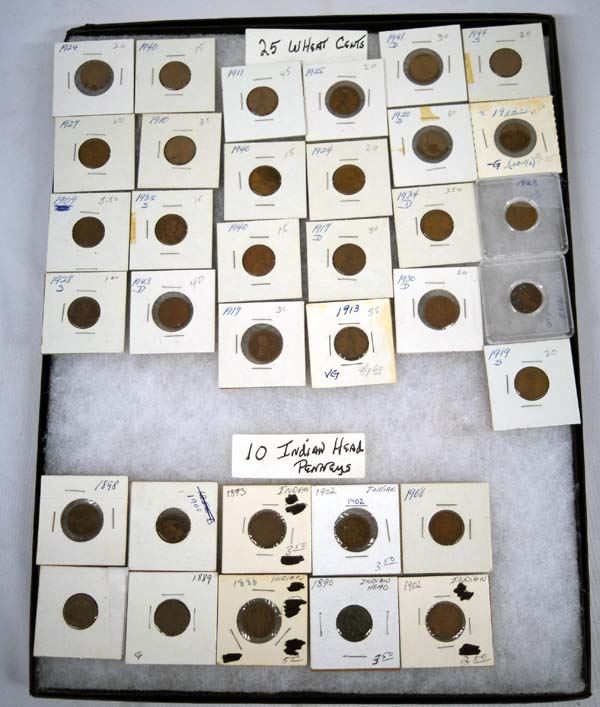 Collection of Wheat Cents and Indian Head Pennies. We have 25 Wheat Cents the oldest being from 1909 and 10 Indian Head Pennies the oldest being from 1890. Wheat Cents (1924, 1940, 1911, 1925, 1941D, 1944S, 1927, 1910, 1940, 1924, 1920, 1912D, 1909, 1935S, 1940, 1917D, 1934D, 1923, 1928S, 1943D, 1917, 1913, 1930D, 1919S, 1915D) and Indian Head Pennies (1898, 1900, 1893, 1902, 1908, 1945, 1889, 1888, 1890, 1902)