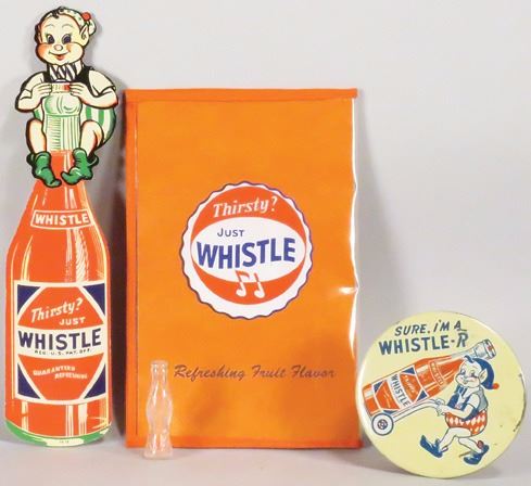 Collection of Whistle Soda Items. Menu sleeve, cardboard string hanger, tin litho badge and miniature bottle. String hanger measures 11 5/8 inches tall.