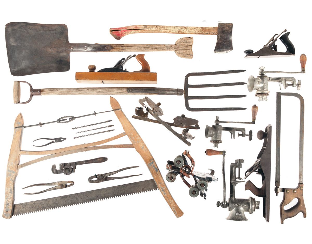 Shovel, pitchfork, ax, 3 meat grinders, 3 planes (1 is unmarked), 2 saws, 3 fence cutters, wrench, 3 drill bits, with pair of Winchester roller-skates and pair of Winchester ice-skates. Fair to good condition.
