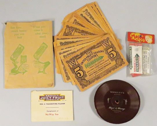 Collection of Wrigley Chewing Gum Ephemra. "Priceless Package" envelope, Juicy Fruit Sample compliments of Nu-Way Inn, United Profi Sharing Coupons, Magic Toys trick pack and Myrt & Marge Radio Entertainment promo record.