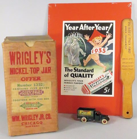 Collection of Wrigley Chewing Gum Items. Wrigley's nickel top jar original box only. 1953 Wrigley's Spearmint Gum original advertisment. Cast toy delivery truck. Advertising wood paddle.