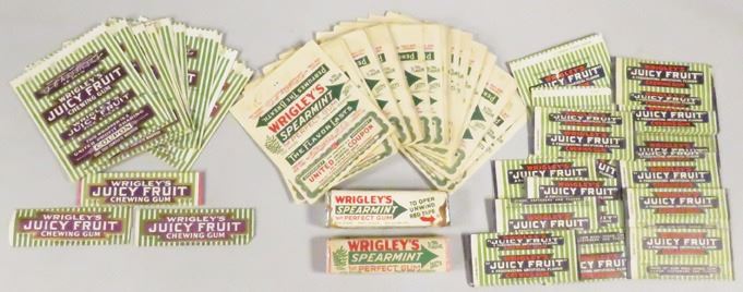 Collection of Wrigley's Chewing Gum Wrappers. (15) Juicy Fruit (red), (19) Juicy Fruit (purple), 2 versions of Double Mint 6 wrappers, (93) Spearmint and (2) Spearmint full packs.