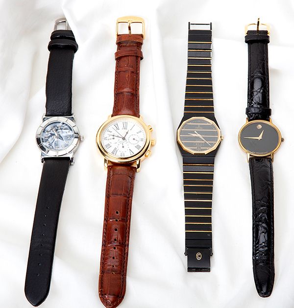 Collection of Wristwatches. Including one Concord Mariner SG black & yellow metal wristwatch, quartz movement, day & date windows; one Movado yellow metal wristwatch, quartz movement, black dial, black strap; one gent's Brizo yellow metal chronograph wristwatch, round case, quartz movement, white dial with black Roman numerals, brown strap and one Activa white metal lady's wristwatch, quartz movement, black strap.