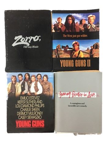 Collection of 4 press kits with black and white publicity stills included, sized mainly 8x10's from 20th Century Fox (1980's-90's). "Young Doctors in Love" (1982) starring Sean Young as Dr. Stephanie, Harry Dean Stanton as Dr. Ludwig, and Dabney Coleman as Dr. Prang, includes 12 publicity stills. "Young Guns" (1988) Emilio Estevez as Billy the Kid, Kiefer Sutherland as Doc, and Lou Diamond Phillips as Jose Chavez, includes 14 stills. "Young Guns ll" (1990) starring Emilio Estevez as Billy the Kid, Kiefer Sutherland as Doc, and Lou Diamond Philips as Jose Chavez, includes 11 stills. "Zoro The Gay Blade"(1981) starring George Hamilton as Don Diego, Lauren Hutton as Charlotte Taylor- Wilson, and Brenda Vaccaro as Florinda, includes 8 publicity stills.