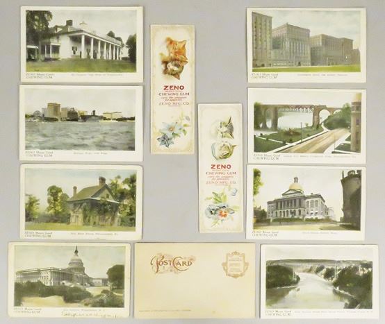 Collection of Zeno Chewing Gum Items. (2) Book marks, one torn on top. (9) Post cards with various sites across America.