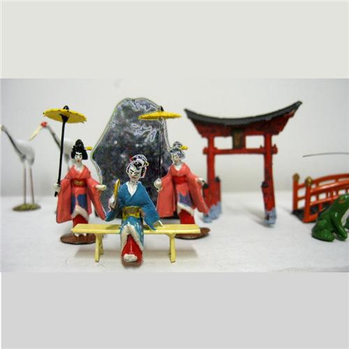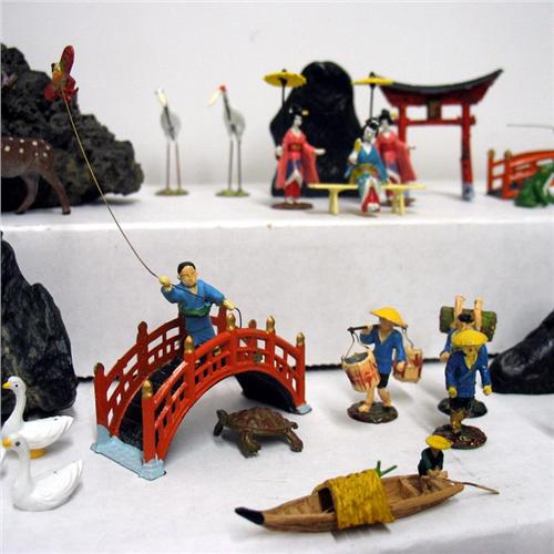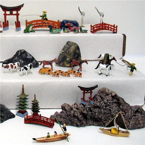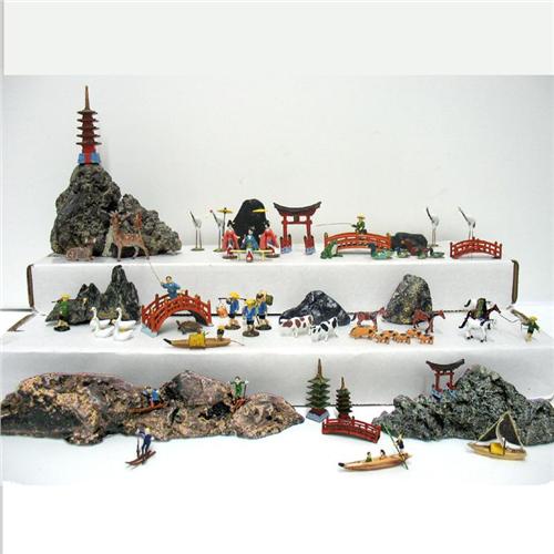 Collection of approximately fifty Japanese lead or tin enameled miniature figures used in Bonkei or tray scenery; each approximately 1" high or less; including figures, animals, and pagodas; and Japanese tray art lava stone simulating mountain with a waterfall; 4" high x 4 1/2" across; 20th C.; no visible defects