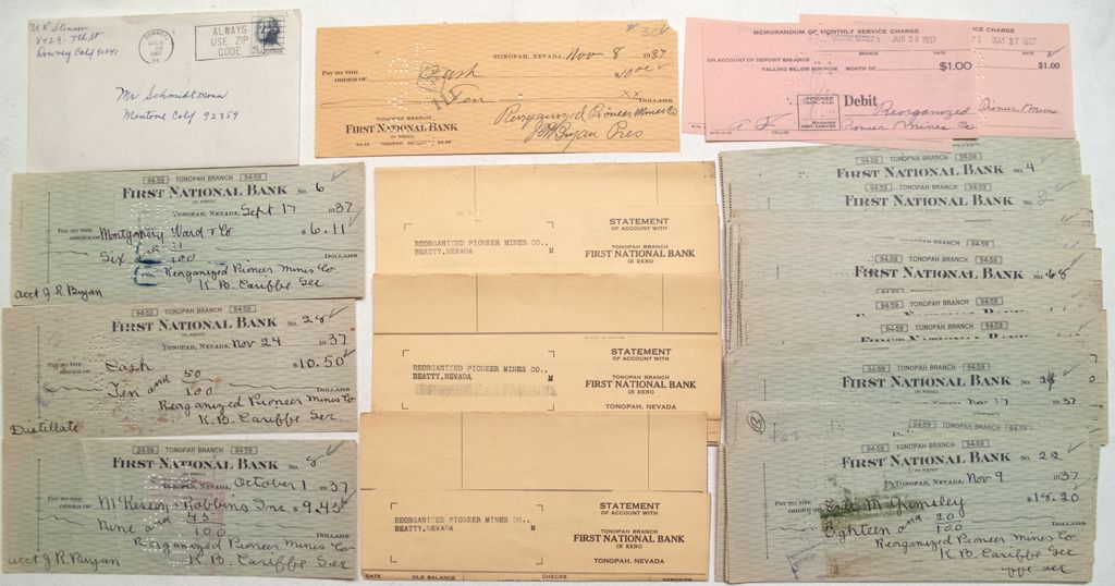 1937. Checks and three statements are from the Reorganized Pioneer Mines Company of Beatty, Nevada