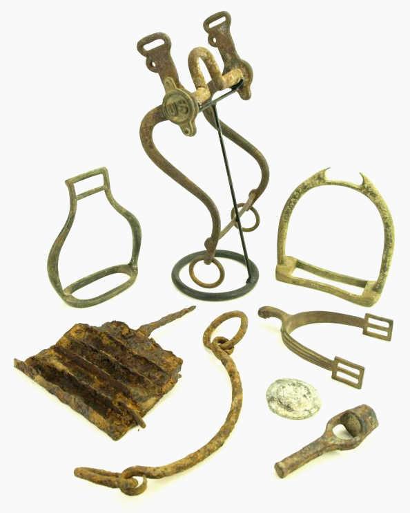 North Dakota military post including US military bit, officers spur, curry comb, snaffle bit, cavalry bridle rosette, two saddle stirrups and leather punch.