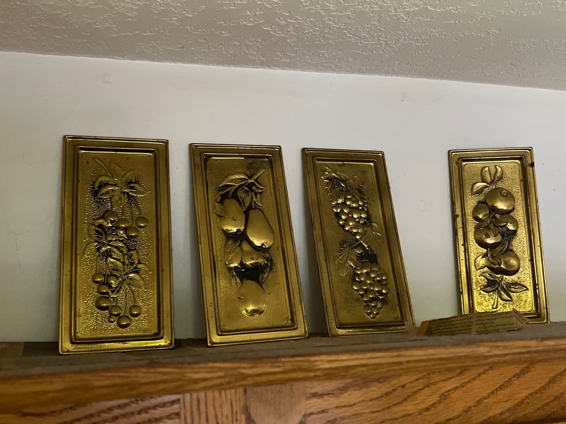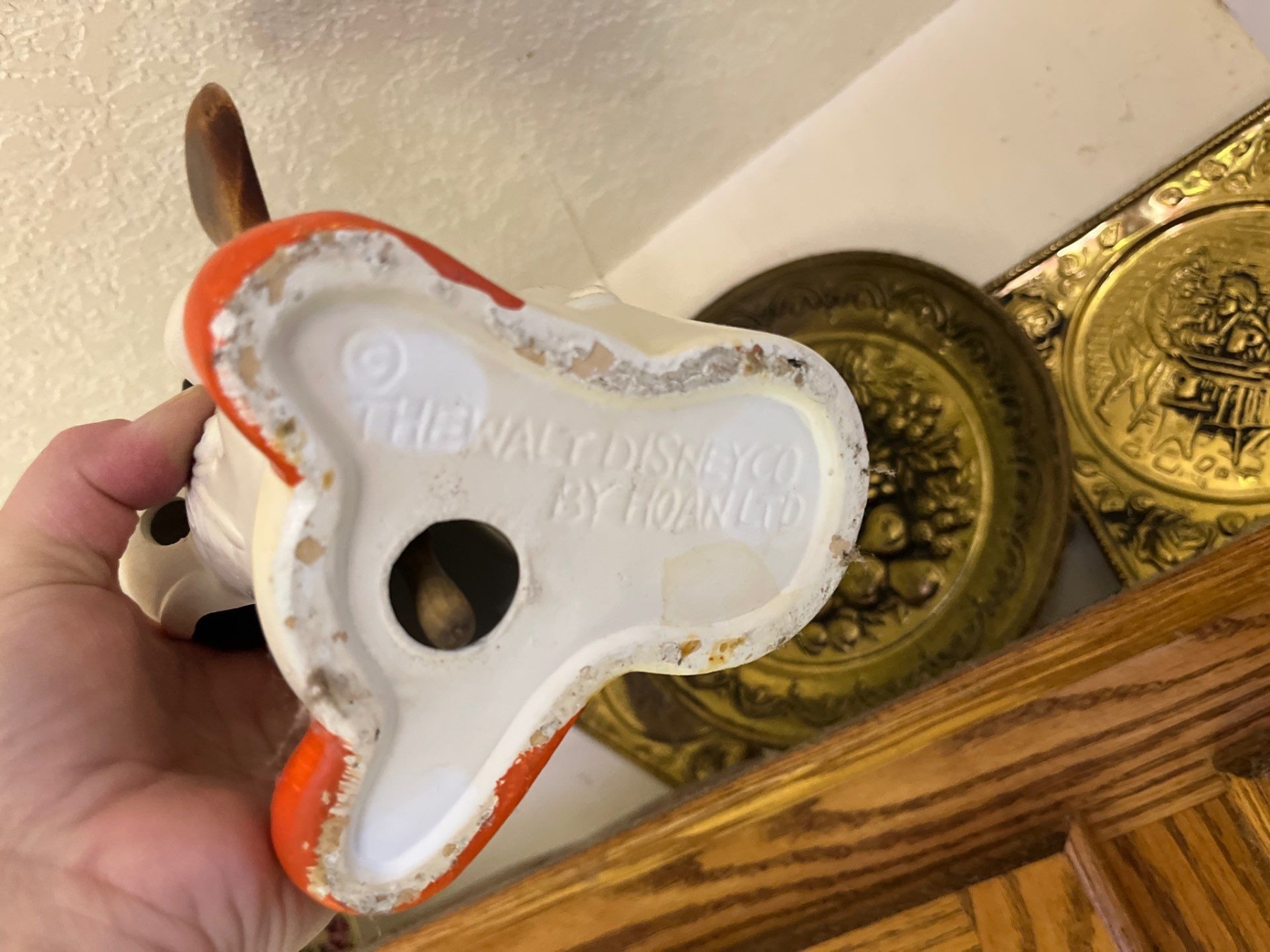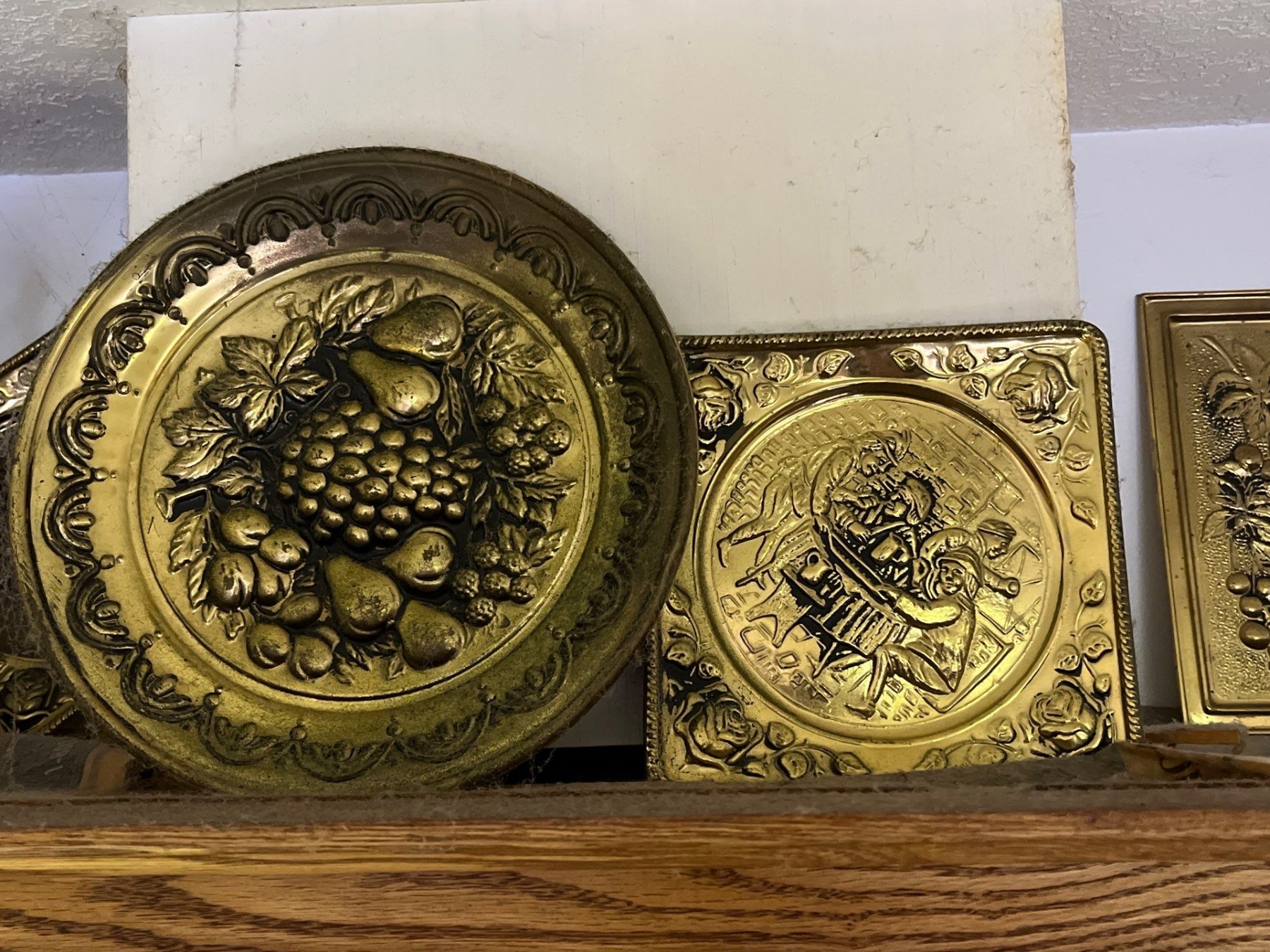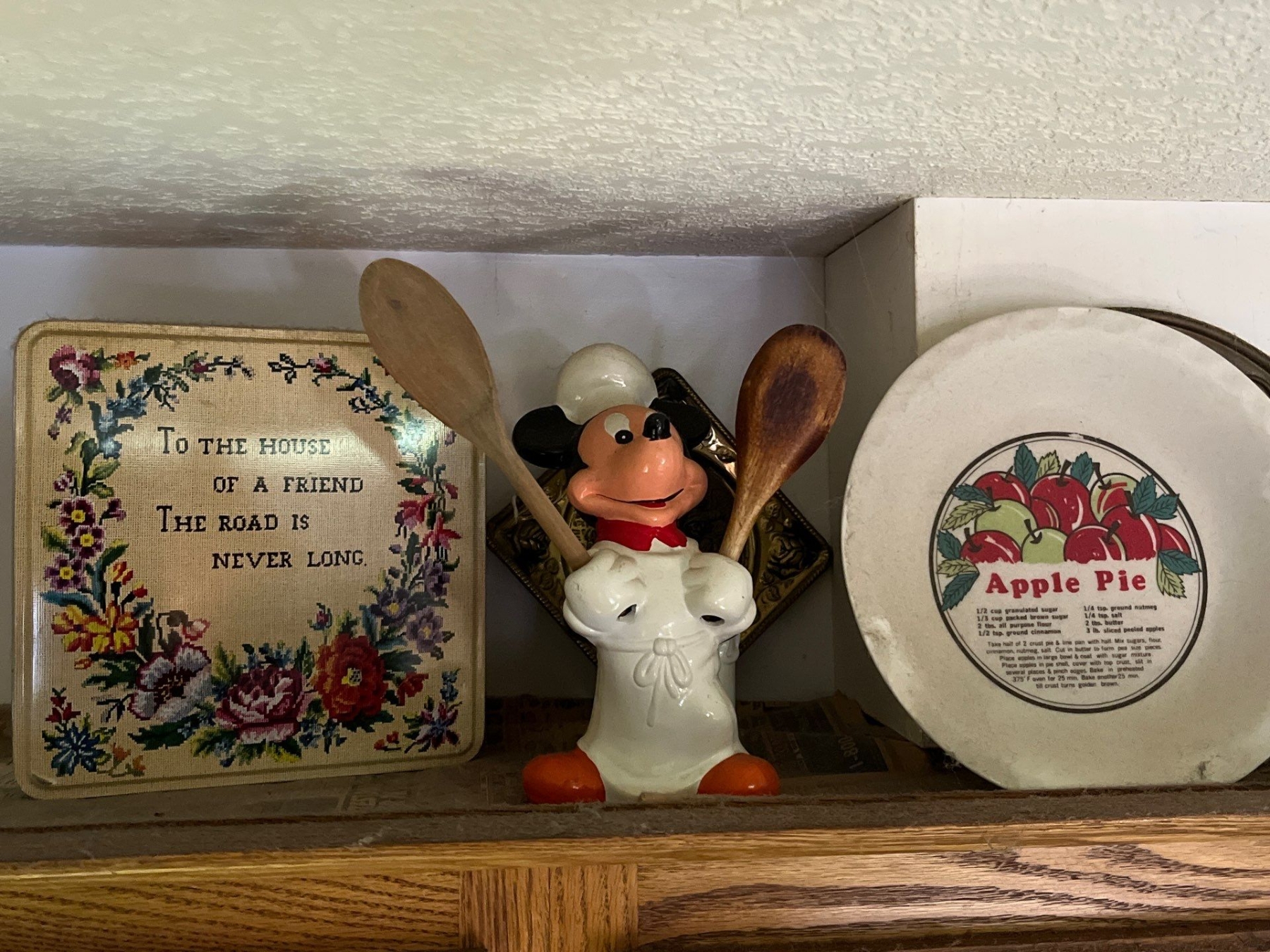 Collection of brass wall items, Apple pie plate and a Mickey Mouse vintage spoon holder
