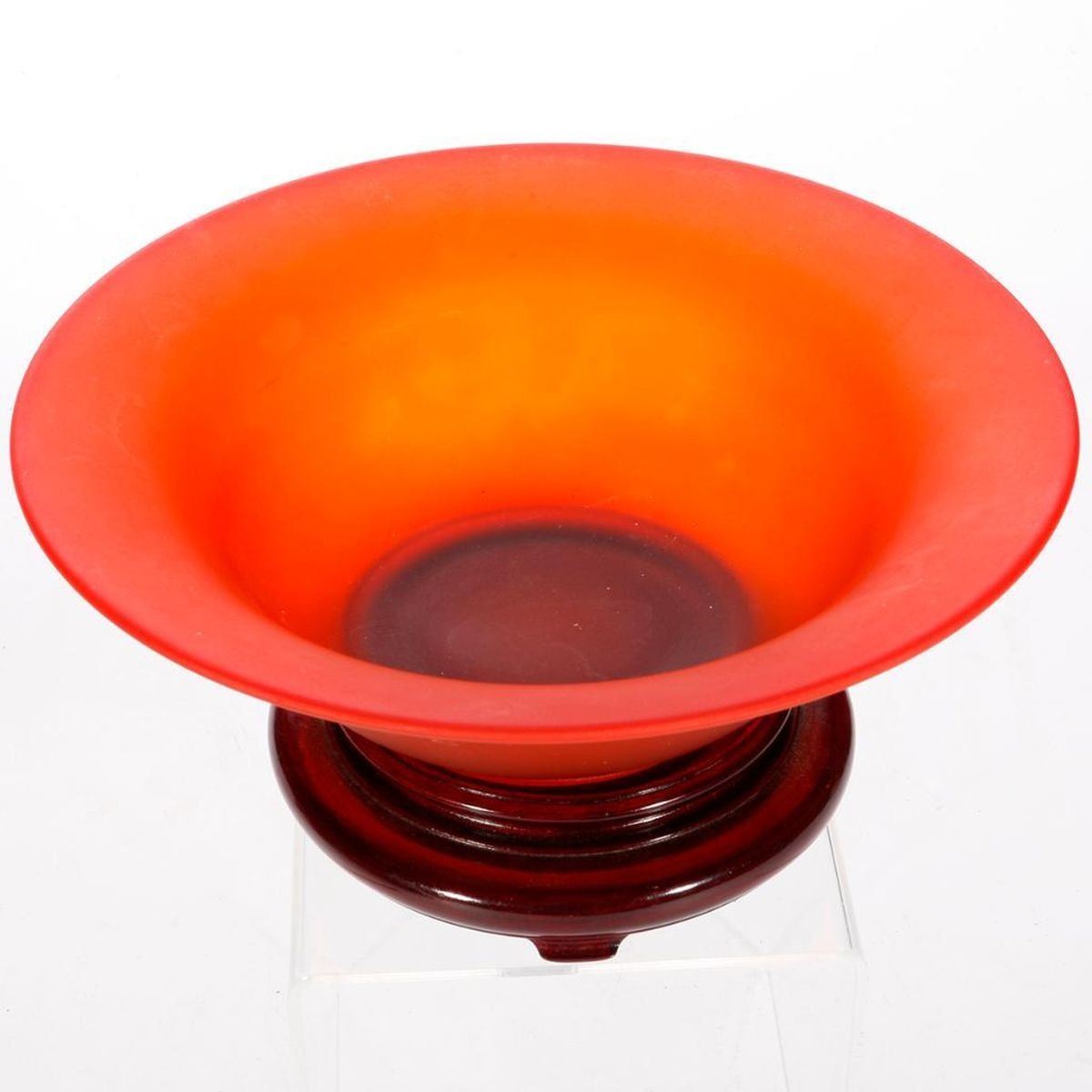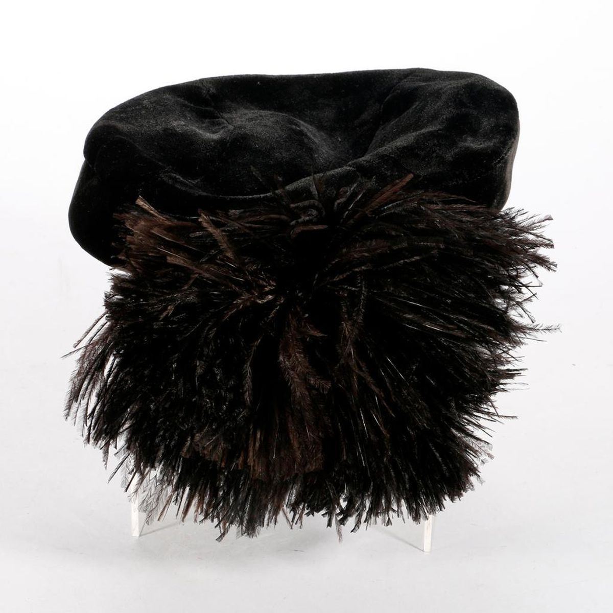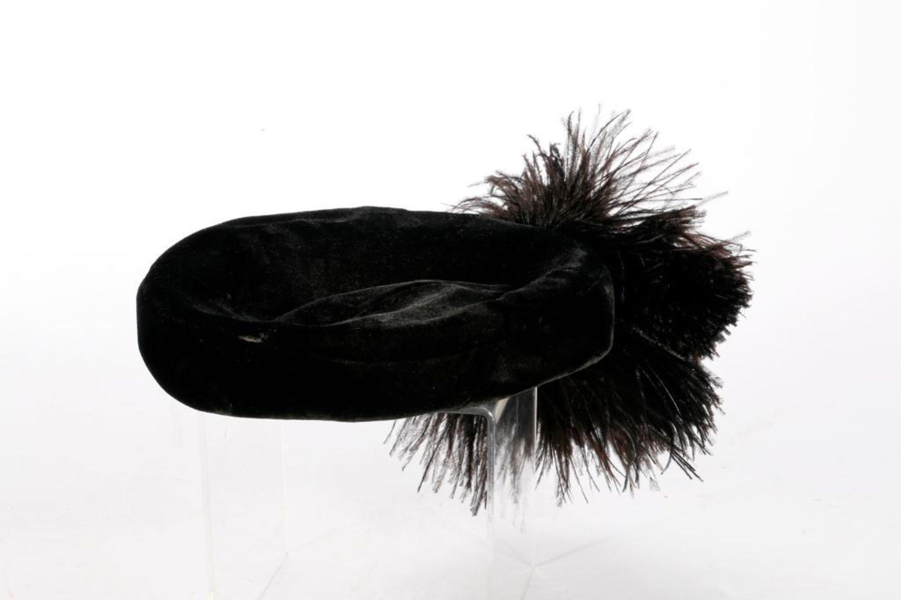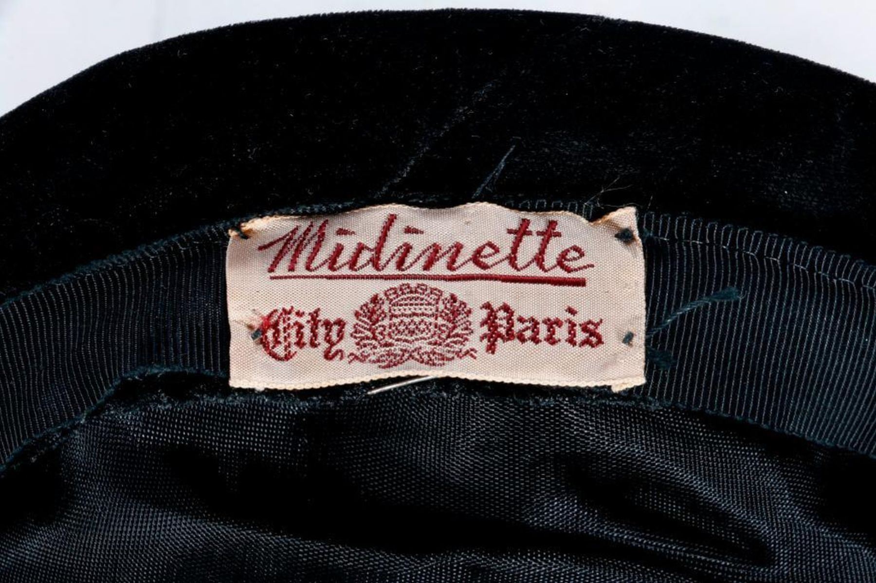 An art glass bowl and stand, a poof and tassel and a beret with a "Midinette City of Paris" tag.