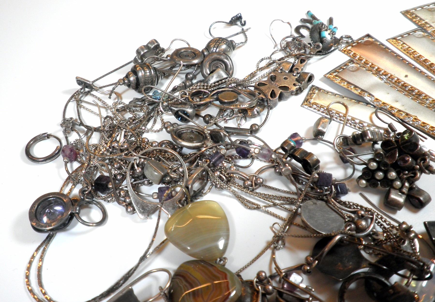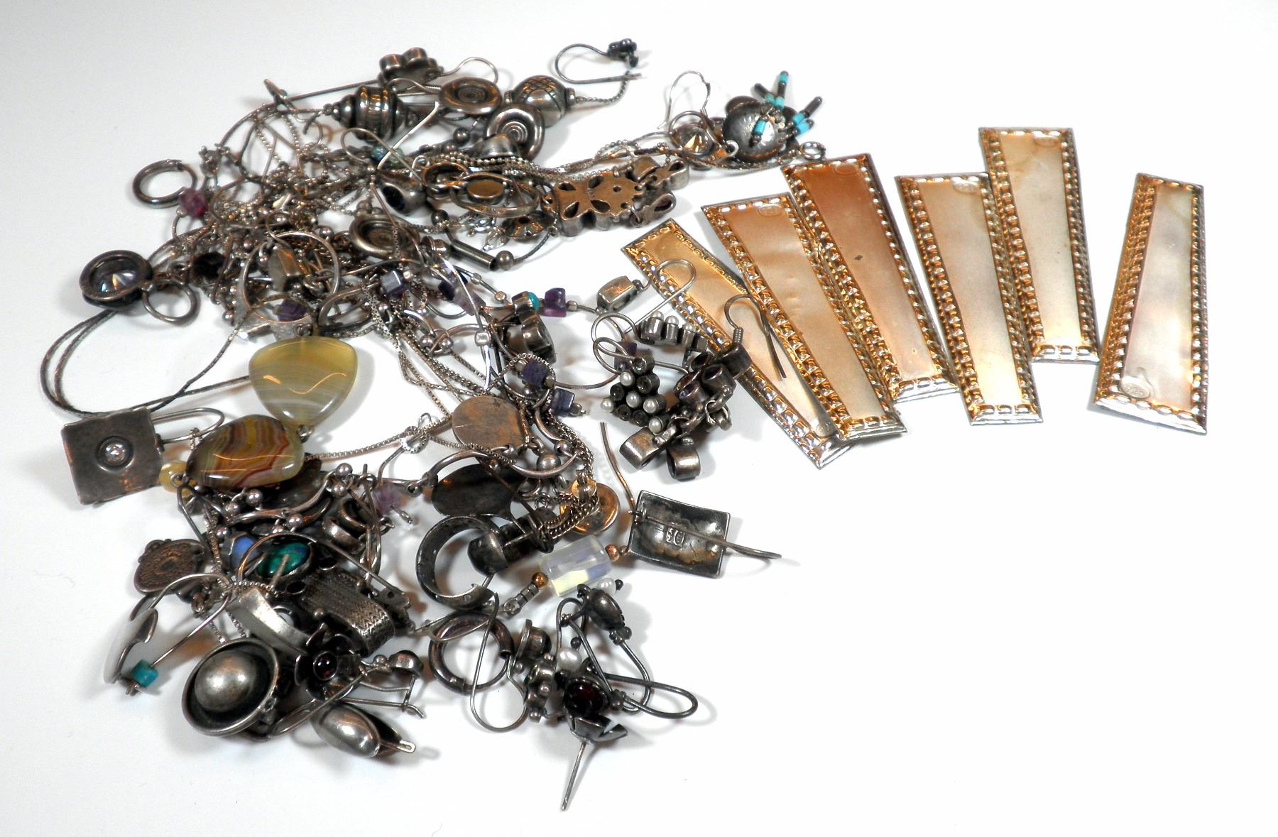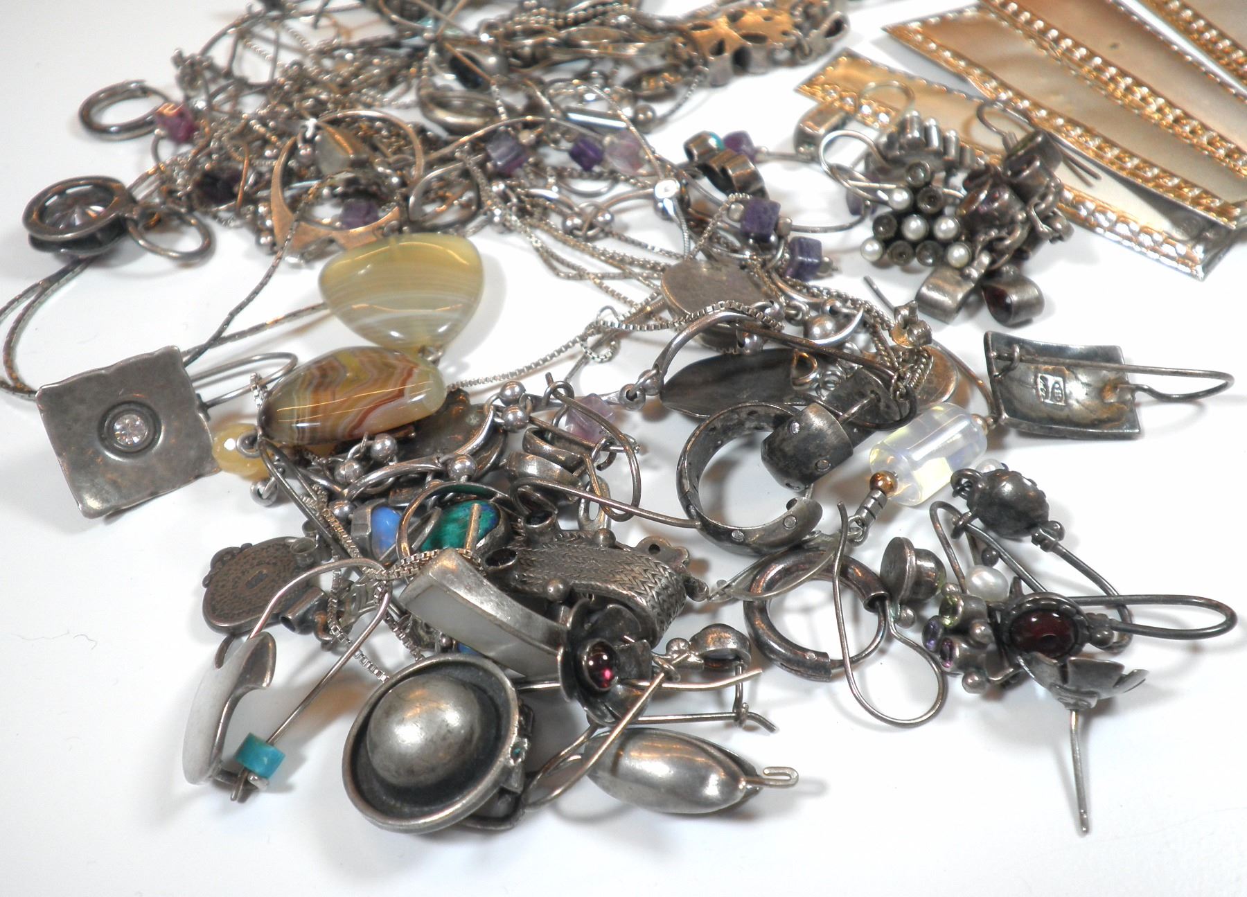 Collection of different silver jewels, some have stone settings, some are single earrings or have missing parts, total weight: 161 gm.