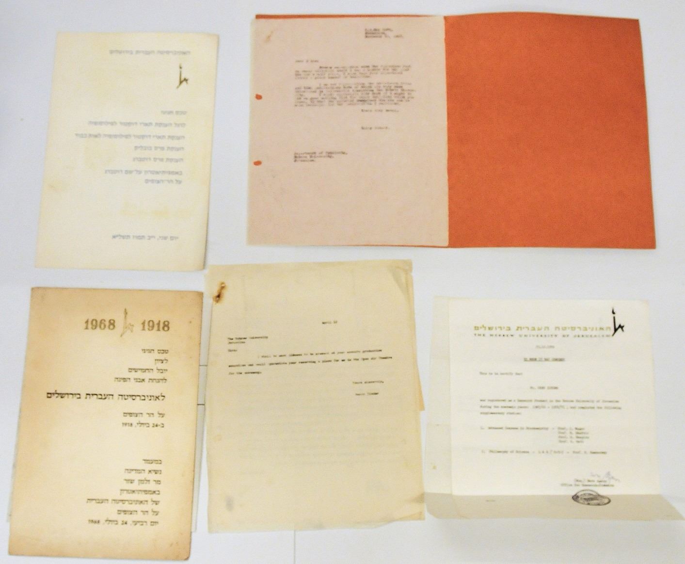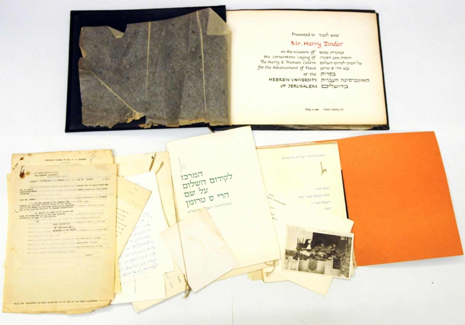 Collection of documents and photographs of the Harry Truman Center for the Advancement of Peace, The Hebrew University of Jerusalem, late 1930s - early 1980s, including Hebrew and English explanatory pamphlets on the Center, handwritten invitations of important public figures, newspaper clippings, letters in Hebrew and English, and an album of photographs prepared as a souvenir from the laying the cornerstone of the Center on the university campus, (1966), which includes 16 photographs and captions in English underneath each of them, as well as other items included in the lot.
