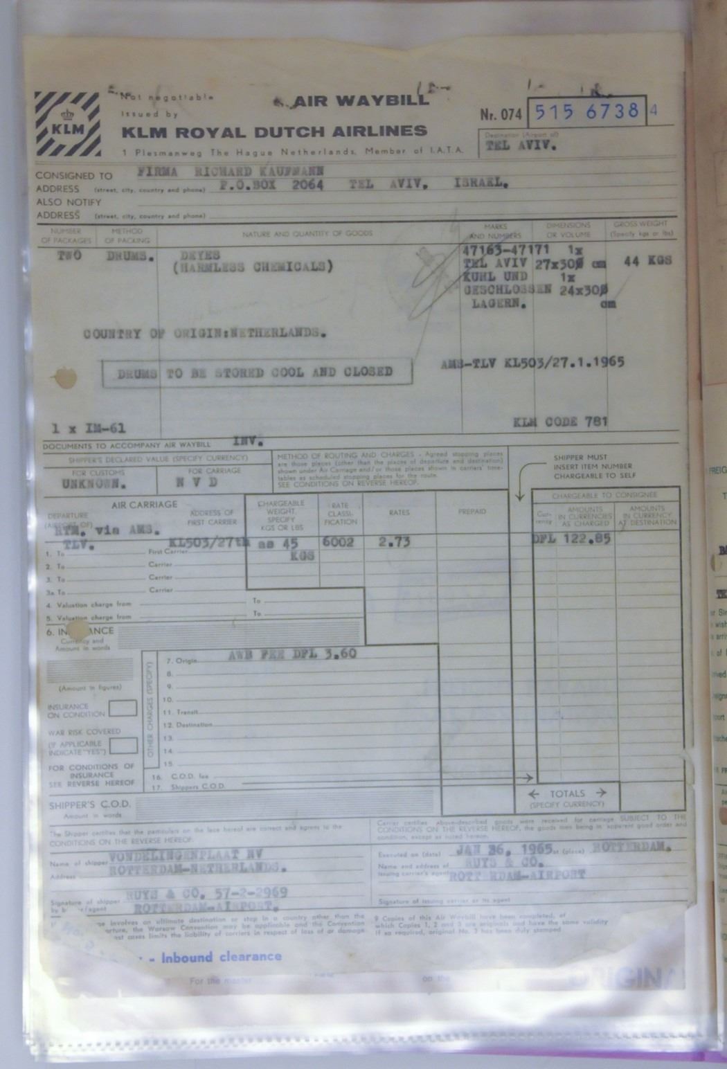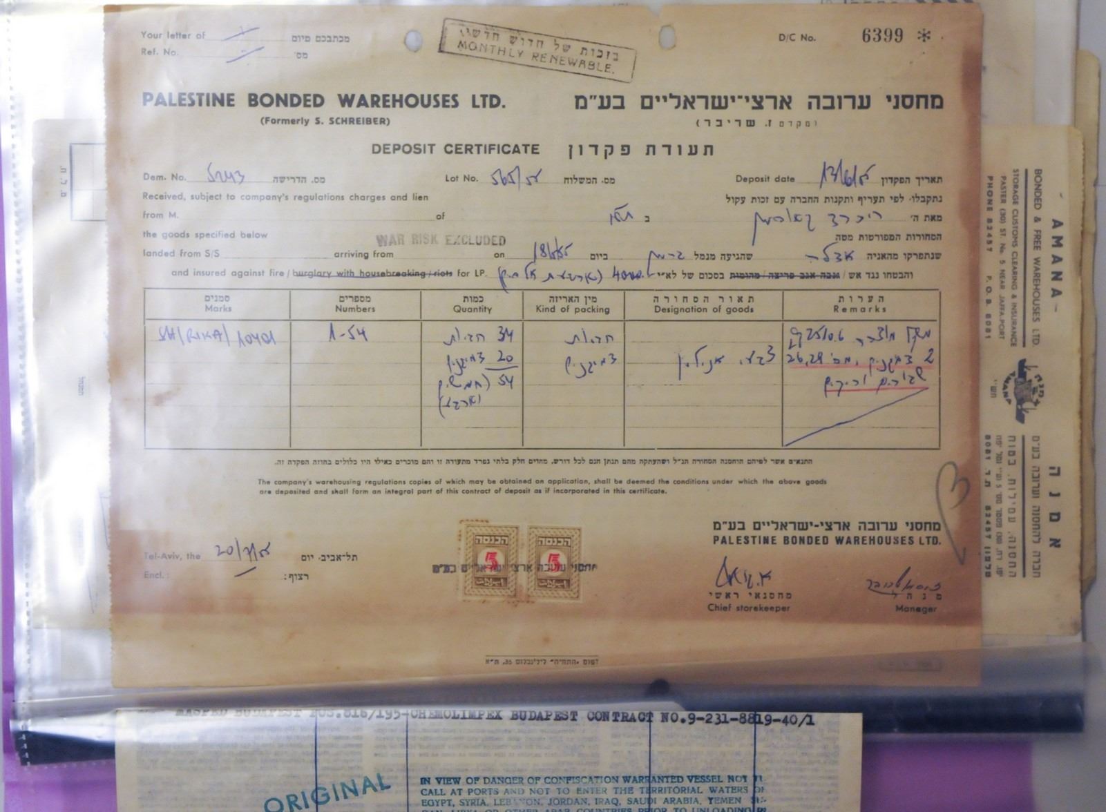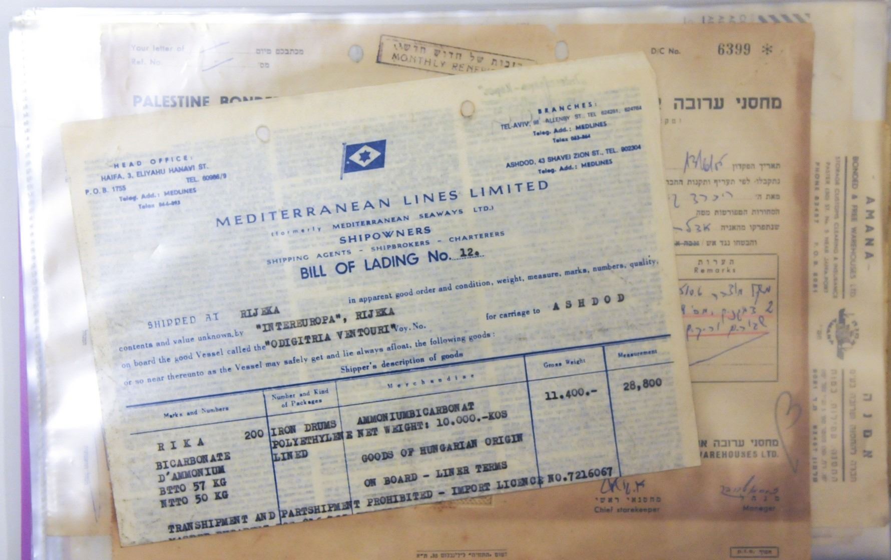 Collection of documents, bills of lading, insurance certificates and receipts related to the transportation of goods and cargoes, 1950s-1960s, including documents of companies such as: Zim, Aruba Eretz Israeli Warehouses, Svirski and Co. and others. In addition, documents of transporting cargoes from and to Israel include travel warnings valid for war zones in the Middle East. Big interesting lot containing dozens of documents.