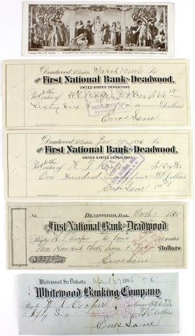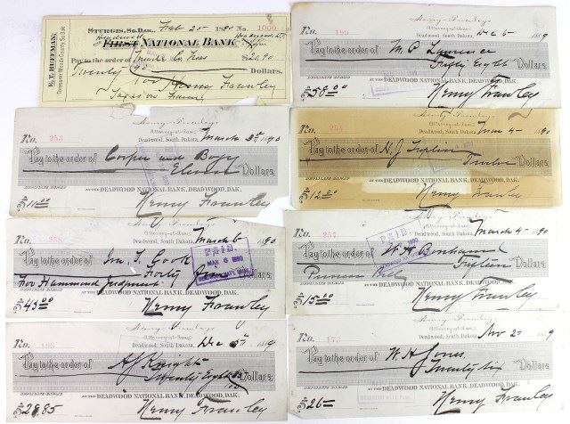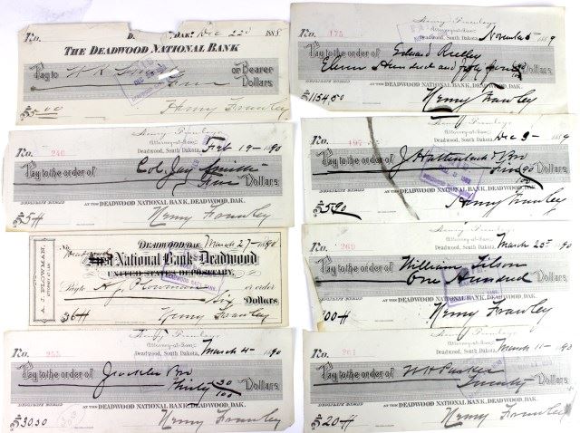 Frawley at Deadwood National Bank, one 1895 Whitewood Bank check signed by Enos Lane who built the Lane Hotel on Whitewood main street and more. Frawley Estate items. Est. 50-100