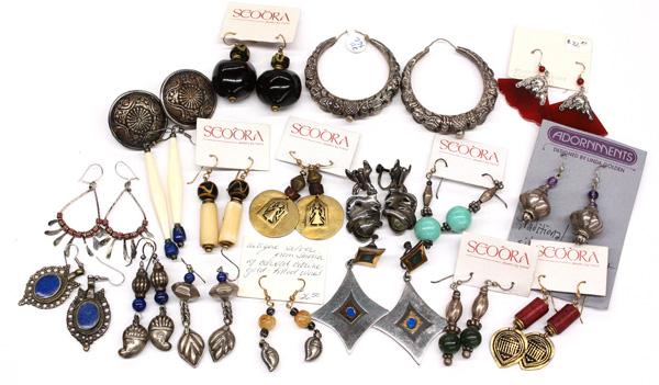 Collection of seventeen pairs of earrings; in silver, brass, bone, turqouise, carnelian, etc