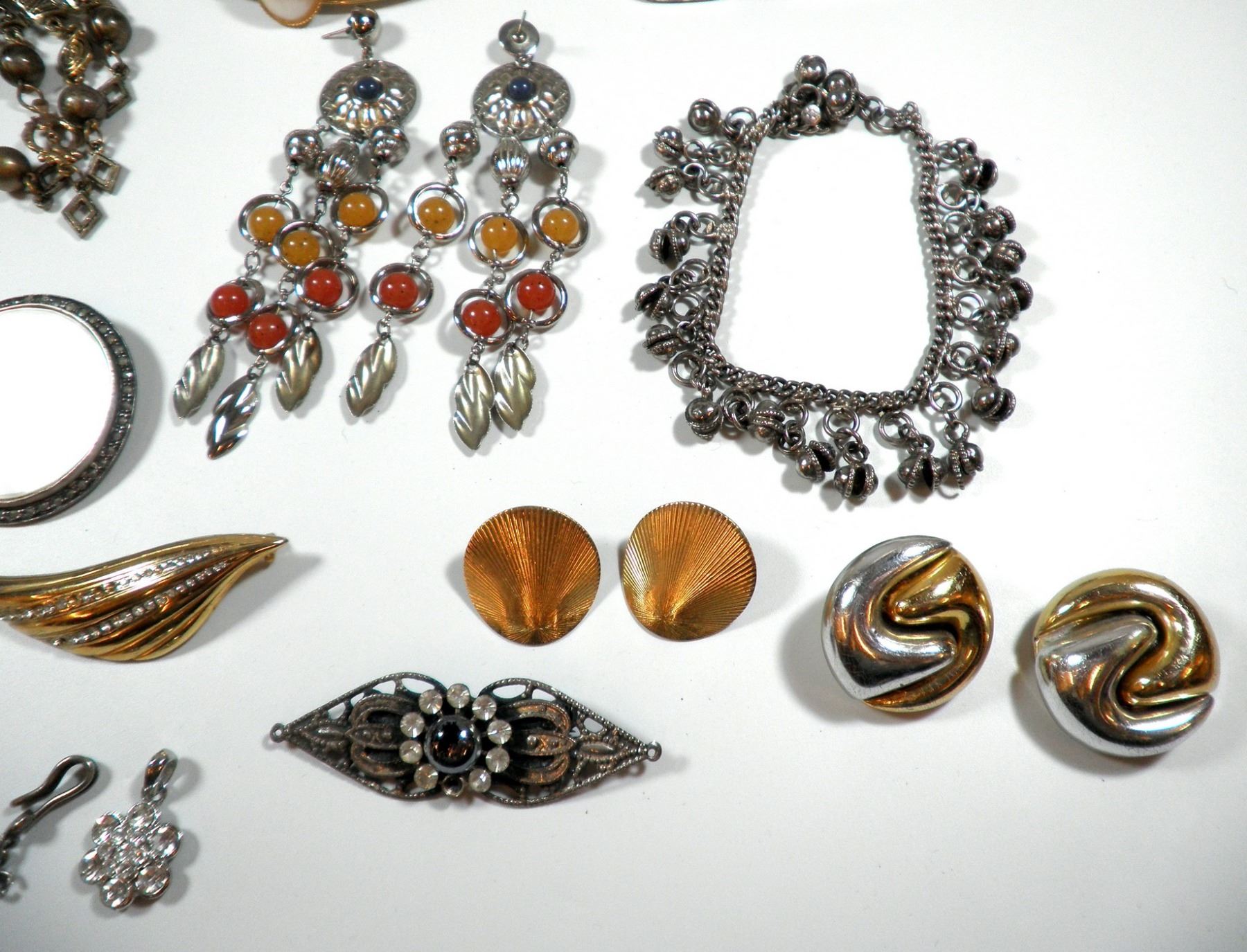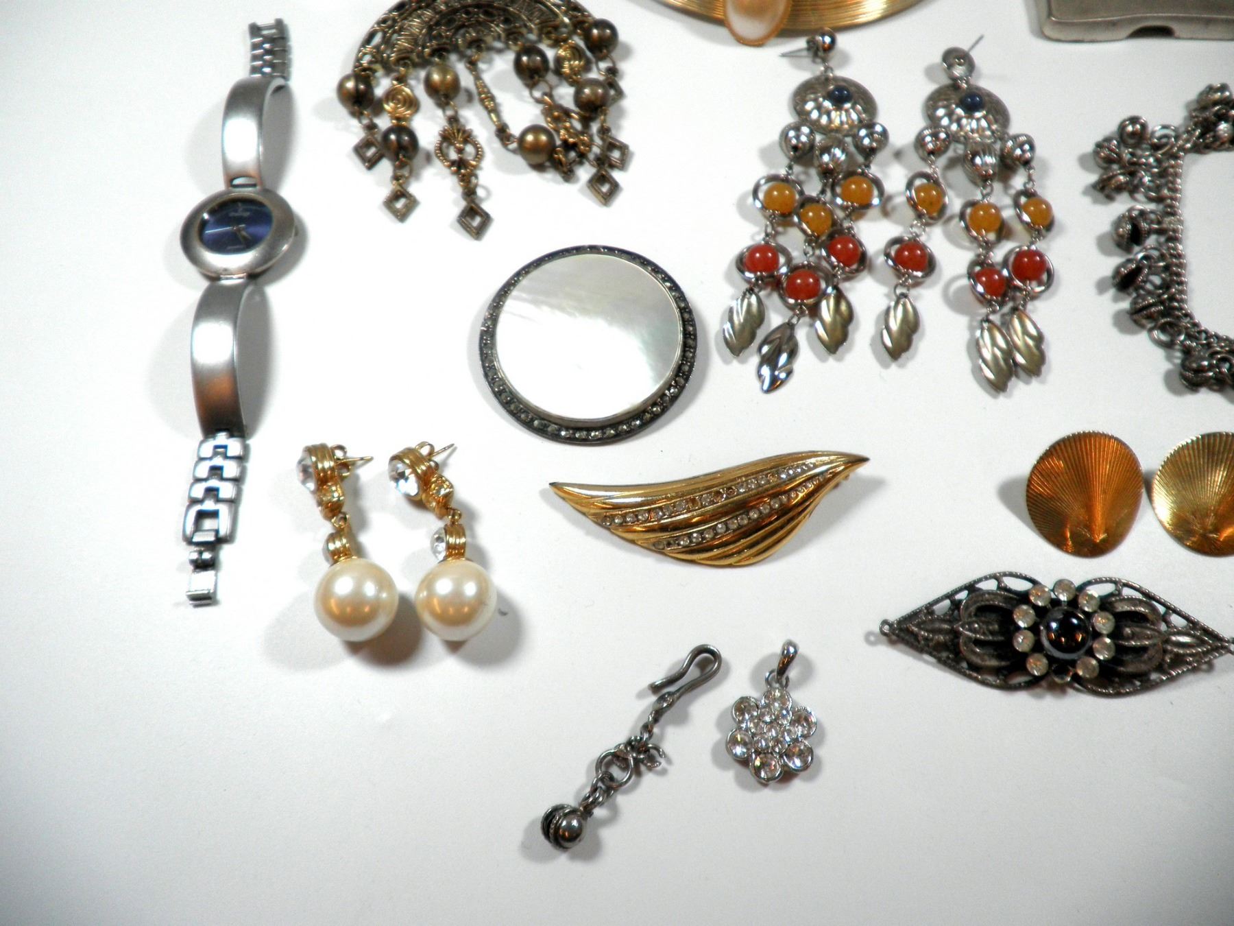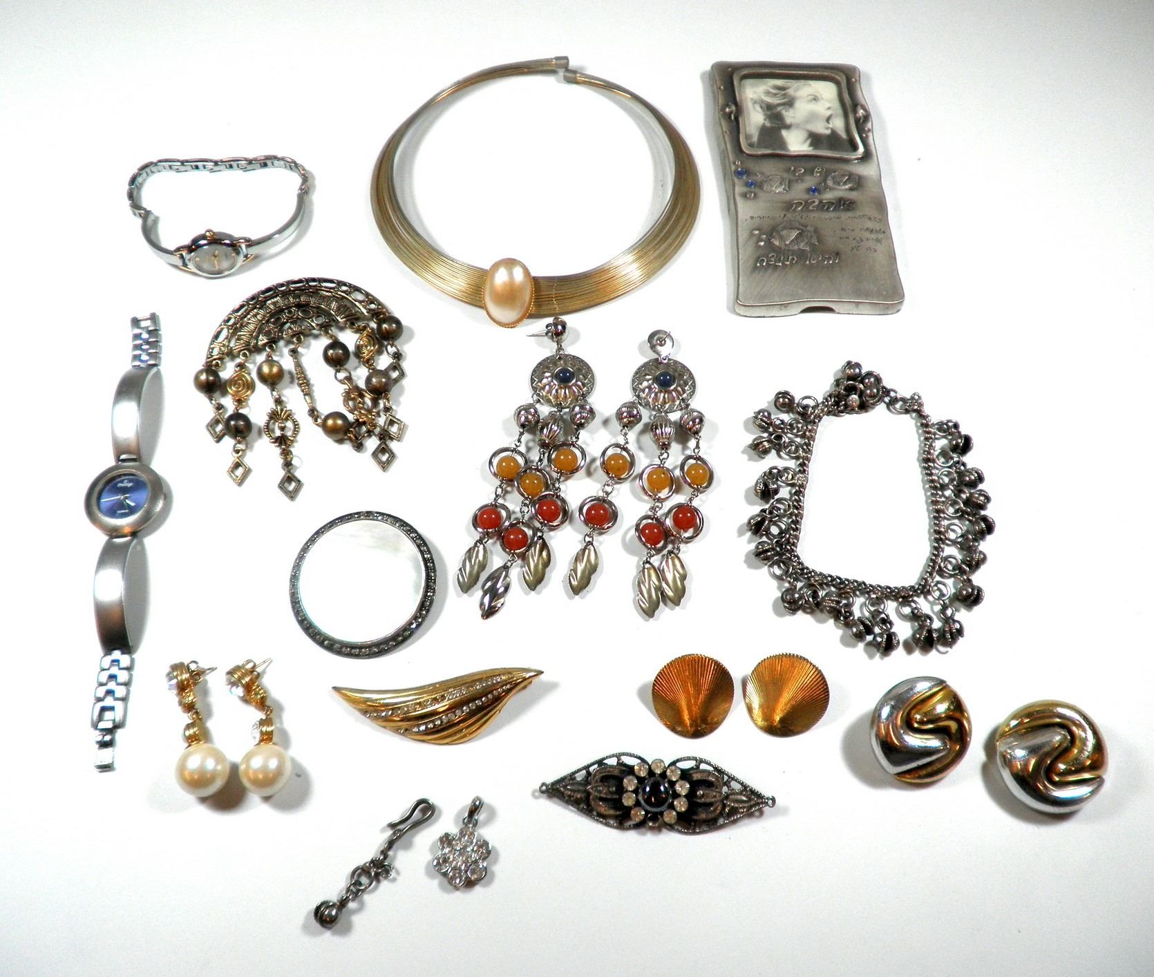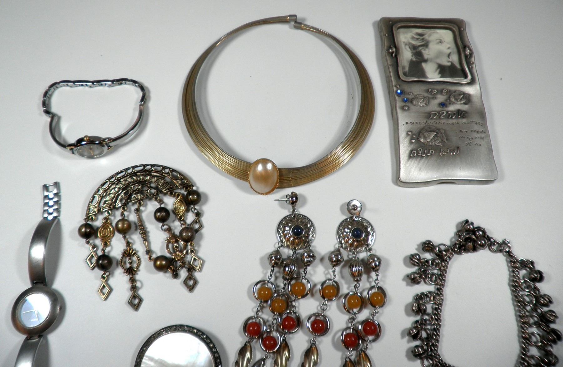 Collection of fashion items, includes earrings, a necklace, a brooch and a picture holder, variable conditions.