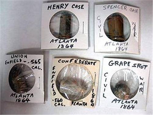 Collection of five Civil War artifacts; Confederate Enfield .560 Cal bullet. Grapeshot, Henry Case, two Spencer Cases and a union Enfield .565 Cal bullet c1864 Atlanta
