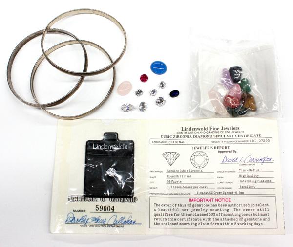 Collection of bracelets and loose gemstones, including; three silver bangle bracelets weighing 44.9 grams, seven round brilliant cut cubic zirconia, four miscellaneous colored gem material/stones, and a sealed bag of miscellaneous tumbled stones