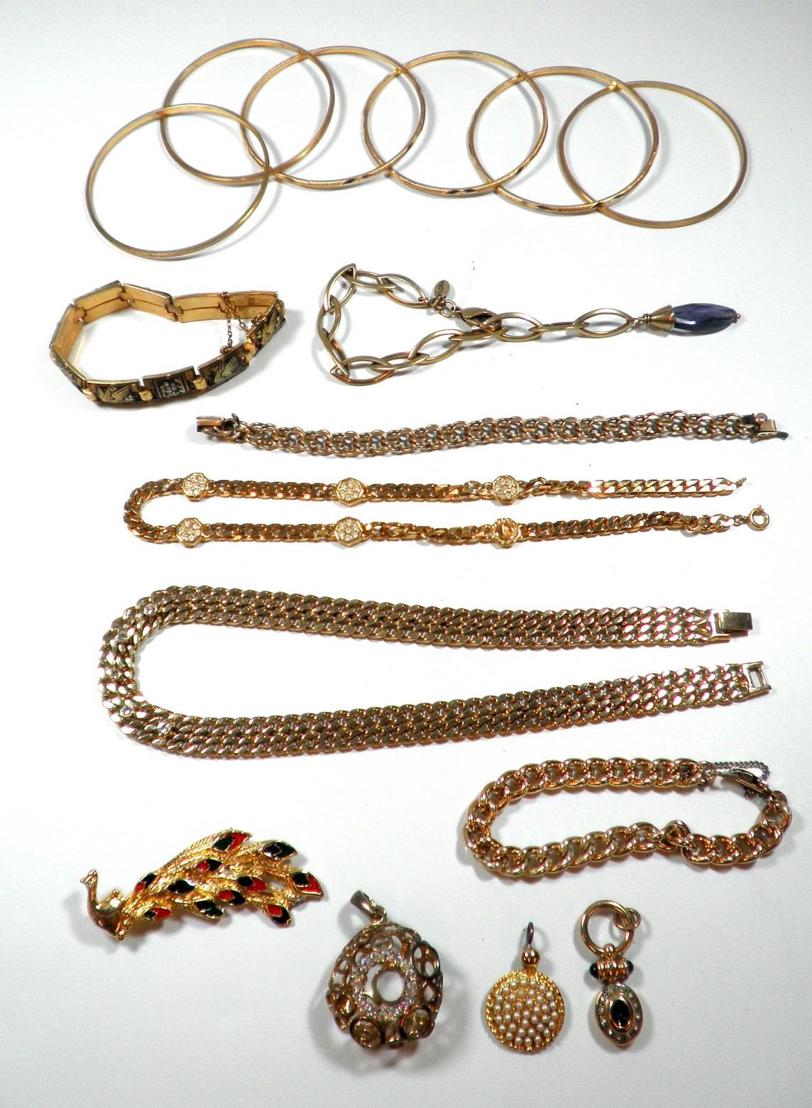 Collection of gilt jewels: 6 bangle bracelets, some are patterned, 4 additional bracelets (one is a Toledo bracelet), 2 necklaces, 3 pendants and a brooch. Some are signed by the designers.