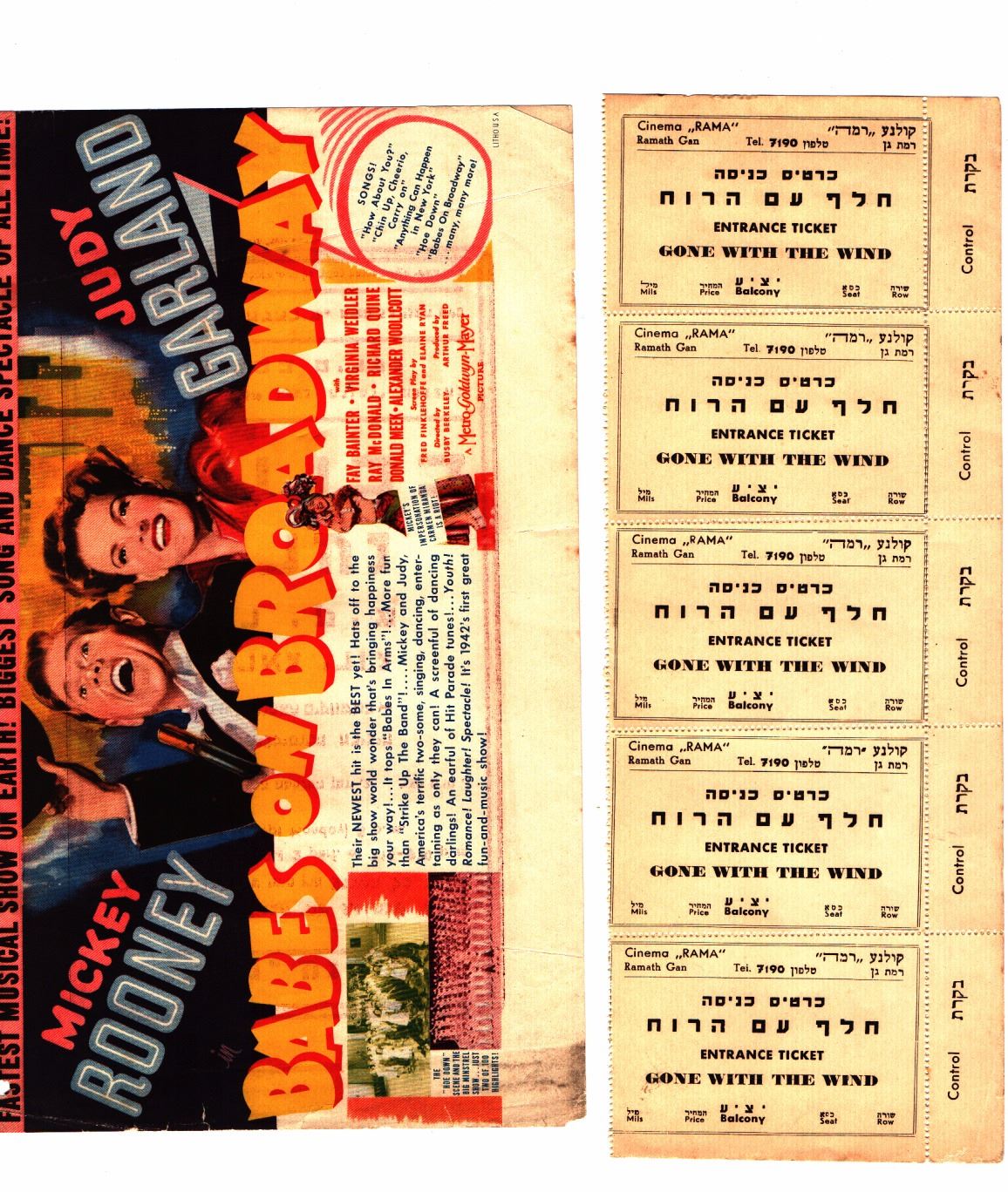 Collection of items related to the Rama Cinema: movie tickets for the film Gone with the Wind and an advertisement for the show Boys on Broadway, good condition.
