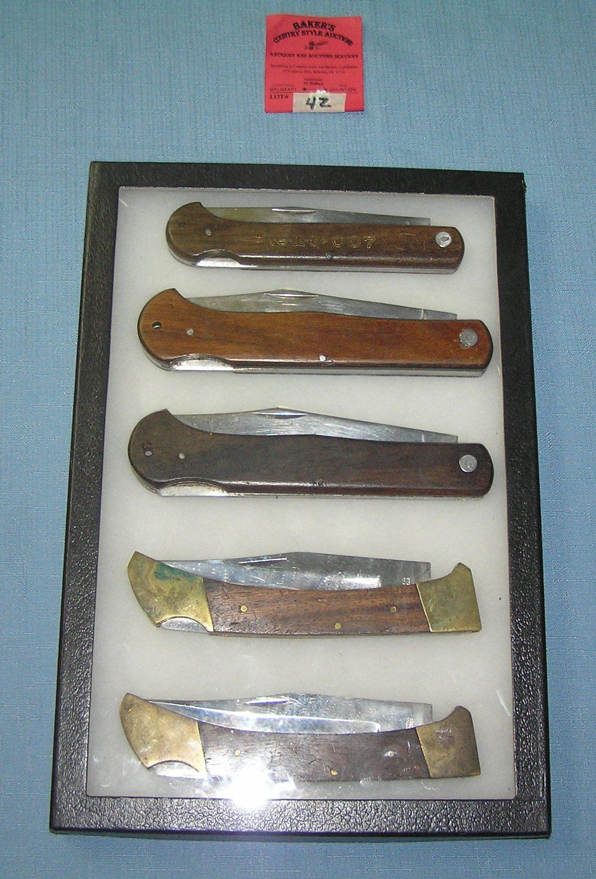 Collection of large pocket knives includes walnut, brass and stainless steel est. value $175.00-$200.00