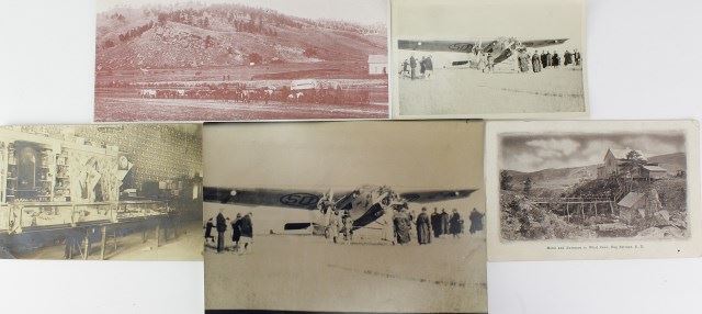 of Clyde Ice's Ford Trimotor airplane 5" X 7", early day ox team in Rapid City SD, original photo of Clyde Ice Tri motor stamped Koller Belle Fourche rppc marked Ed Taylor in his jewelry store Custer SD and rppc Hotel and Entrance to Wind Cave with horses and carriages with covered wagon in background. Est. 25-75