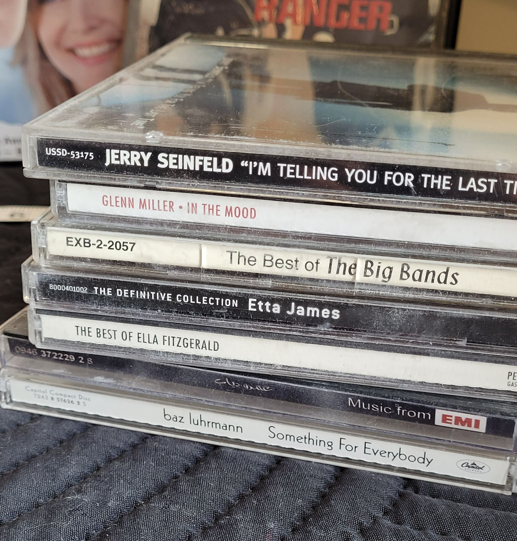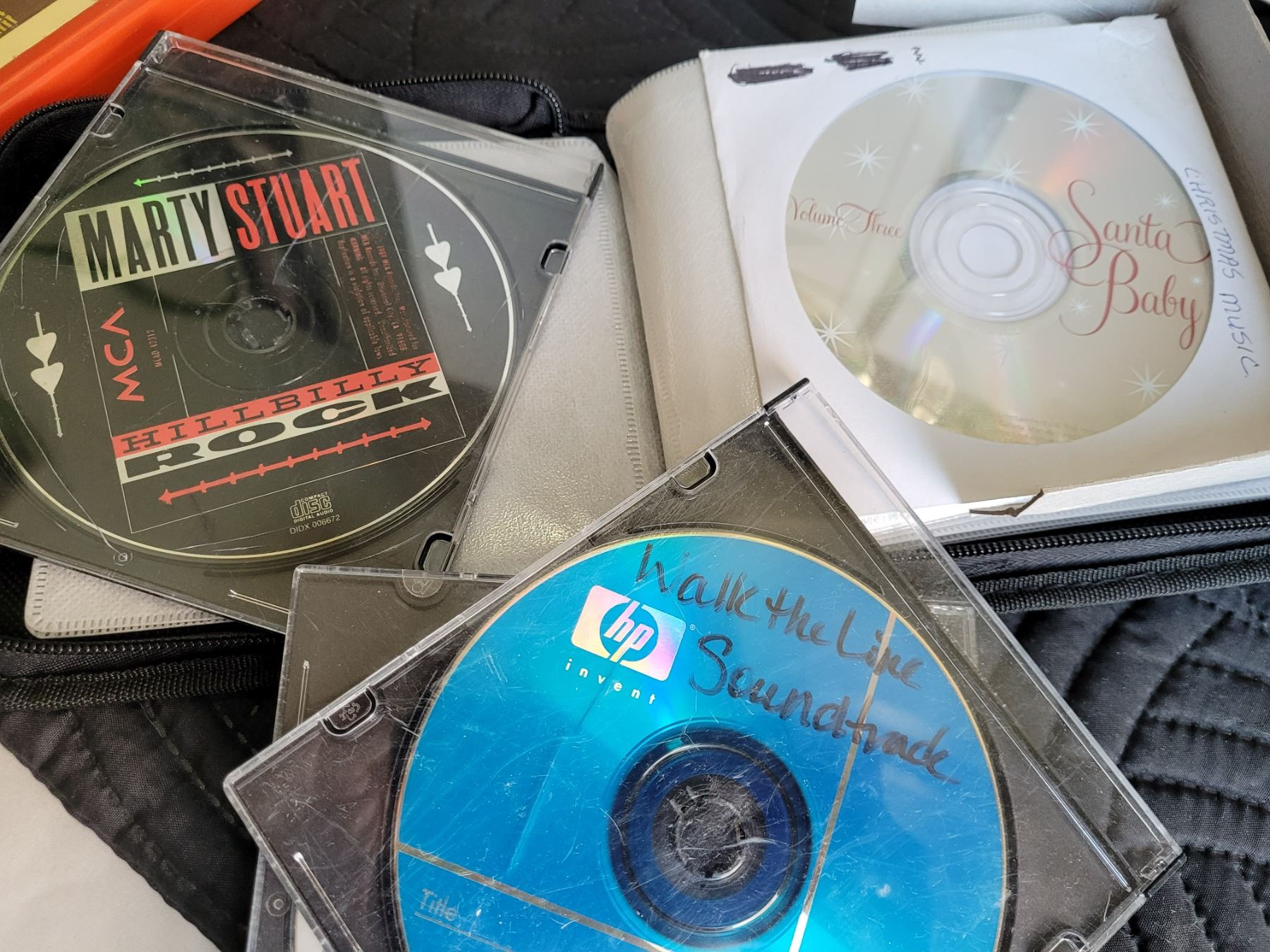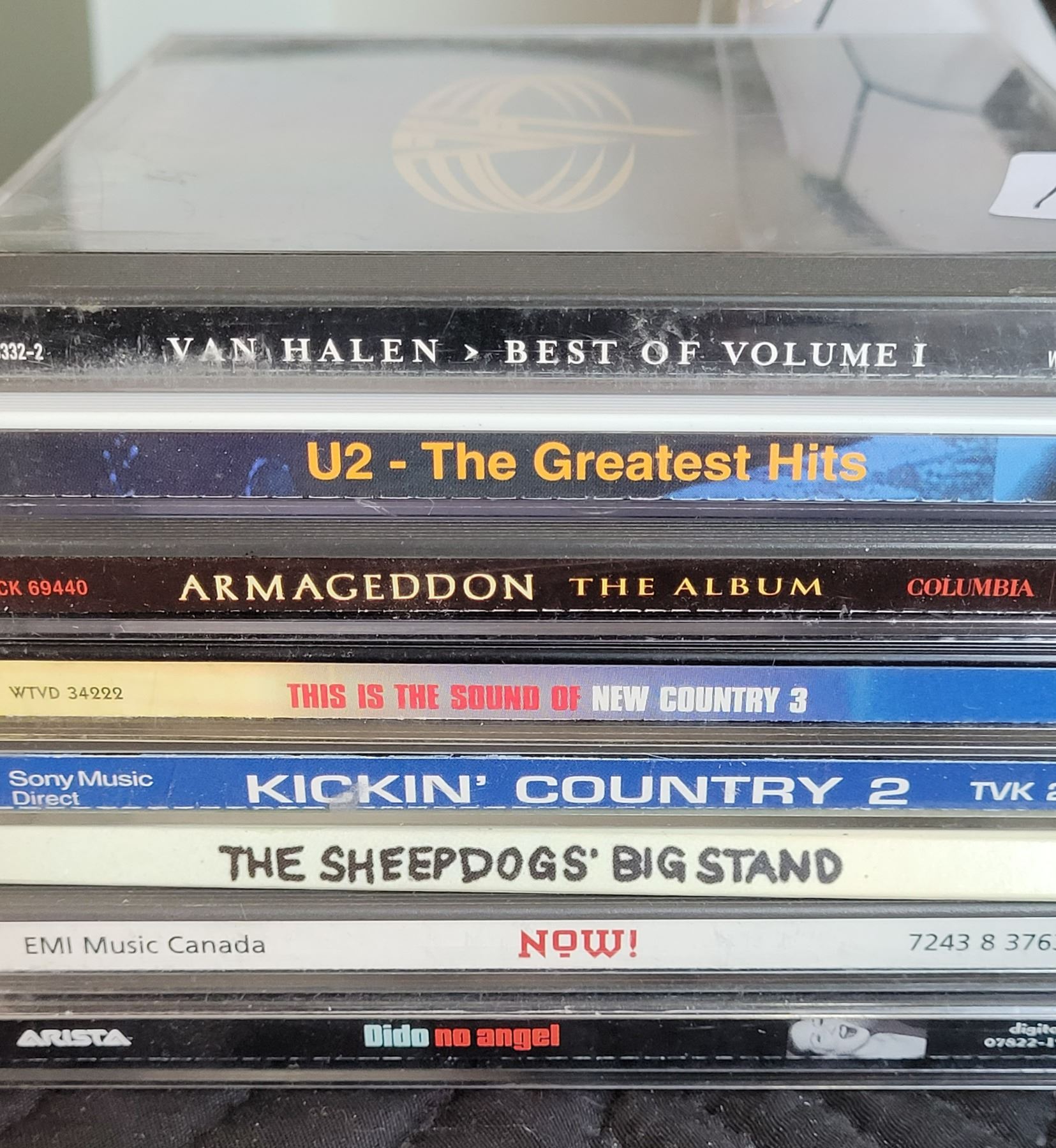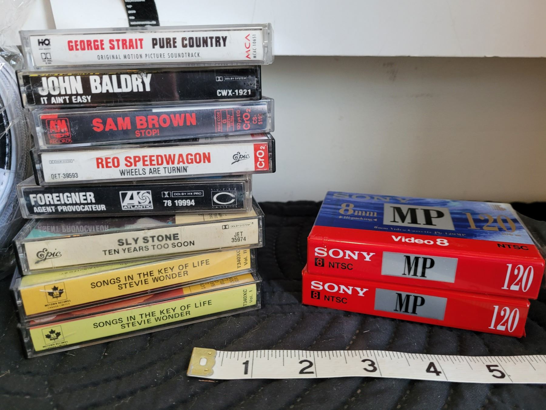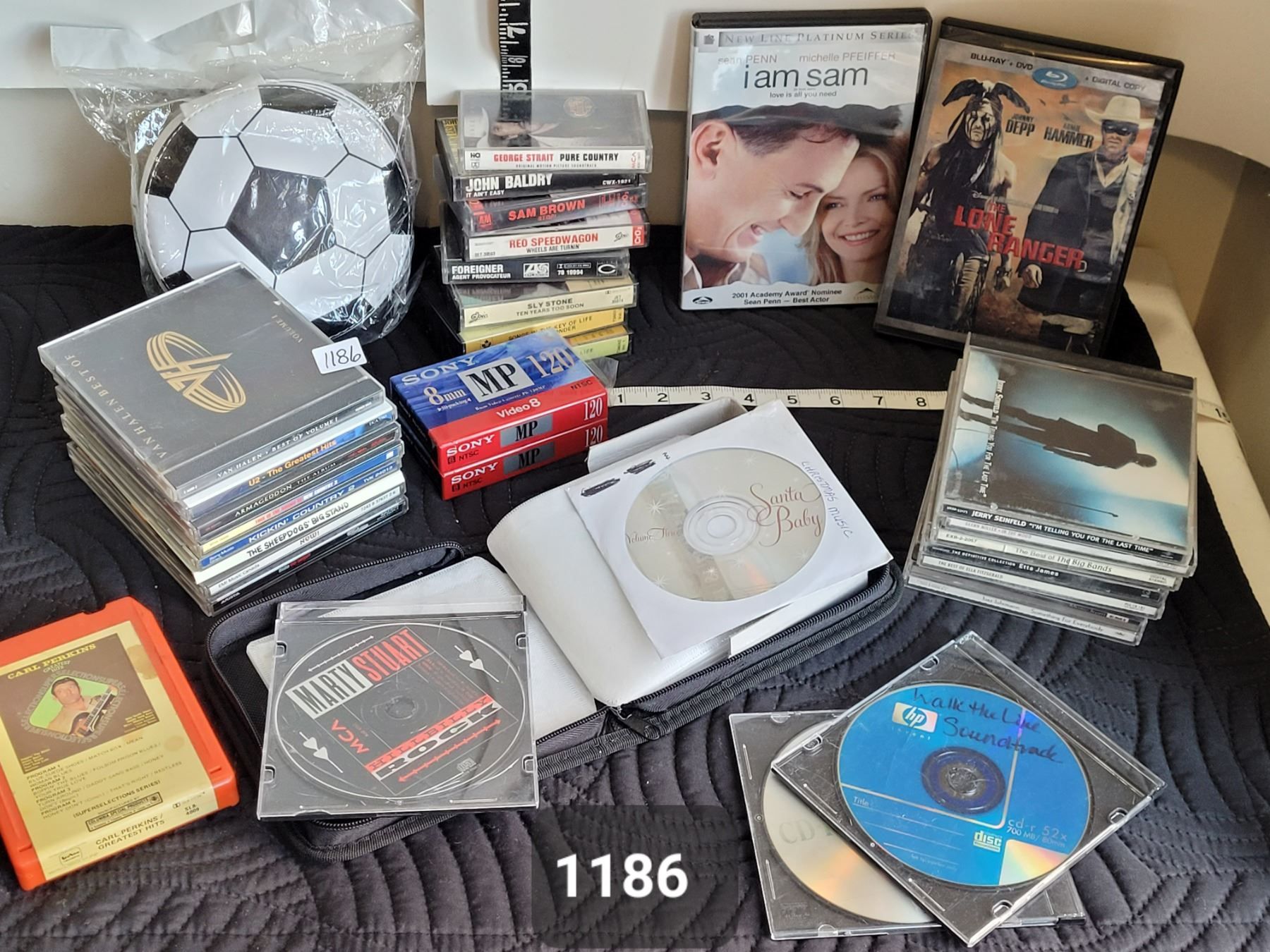 Collection of music on 8 track, cd, dvd, cassette plus 2 cases for discs.