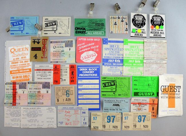 Collection of music tickets, stubs, back stage and crew passes from concerts including Queen Wembley (86), Bruce Springsteen (81), Phil Collins Albert Hall (85), Prince's Trust (82), The Drifters (85), Chuck Berry (83), Rod Stewart (80/81), Simon & Garfunkel (82), Al Stewart (80), Steve Miller Band (82), Huey Lewis (86), Pink Floyd The Wall Tour, Eric Clapton (85) and others (32 in total)