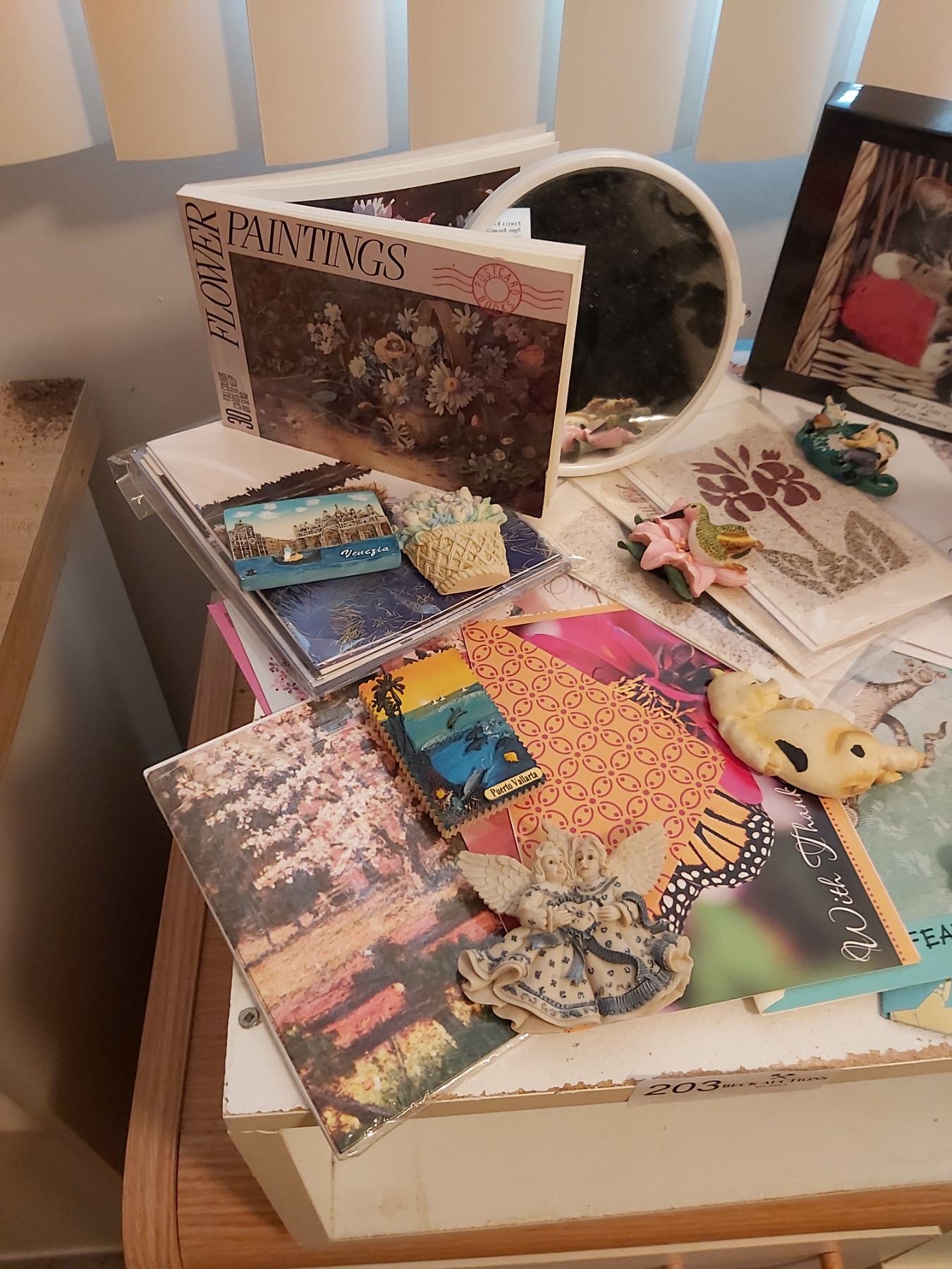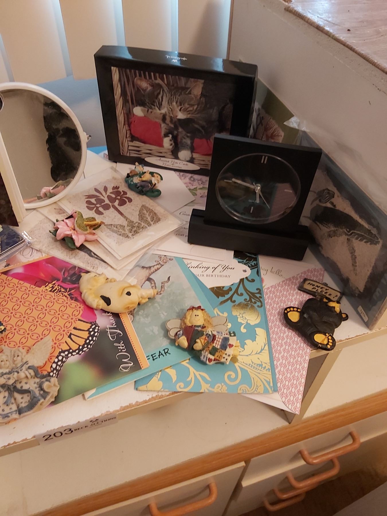 Collection of note cards, fridge magnets, quartz clock & mirror