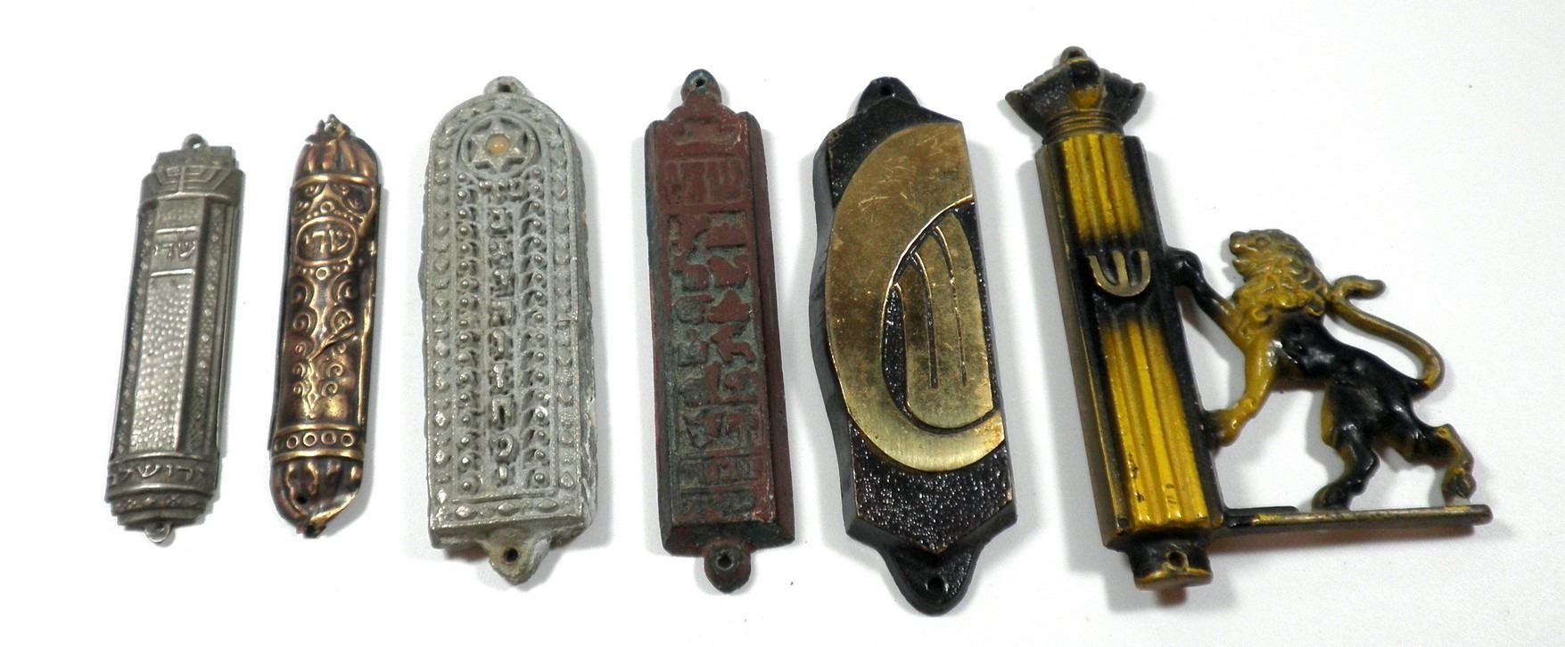 Collection of old Israeli mezuzah cases, includes a mezuzah case by Tzel Zion Tel Aviv embellished with a lion leaning against a classic colomn with a Torah crown, and a mezuzah case by Bezalel from circa the 1950s. Good-very good conditions: reasonably timeworn. Length: 6.5-8.5 cm.
