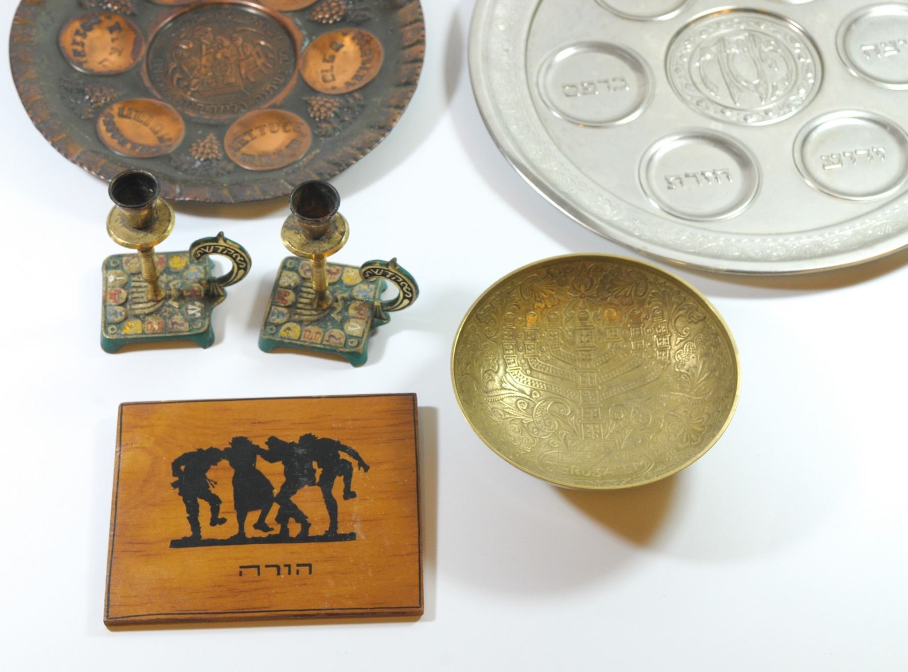 Collection of old Israeliana items: 1. Metal Seder plate by Karshi, 'Gift to the new Olim' given by the Hornstein Fund, Ministry of Religion, Diameter: 32 cm. 2. Copper pierced Seder plate, diameter: 24 cm, 3. Pair of brass Shabat candelsticks decorated with green patina and reliefs of the 12 tribes, slightly worn, height: 10 cm, 4. Wooden wall-mounted plaque with a black silhouette of people dancing and the inscription: 'Hora',dimensions: 15.5x12.5 cm, brass bowl with decoration of the Temple menorah and the inscription 'Jerusalem', diameter: 14.5 cm.