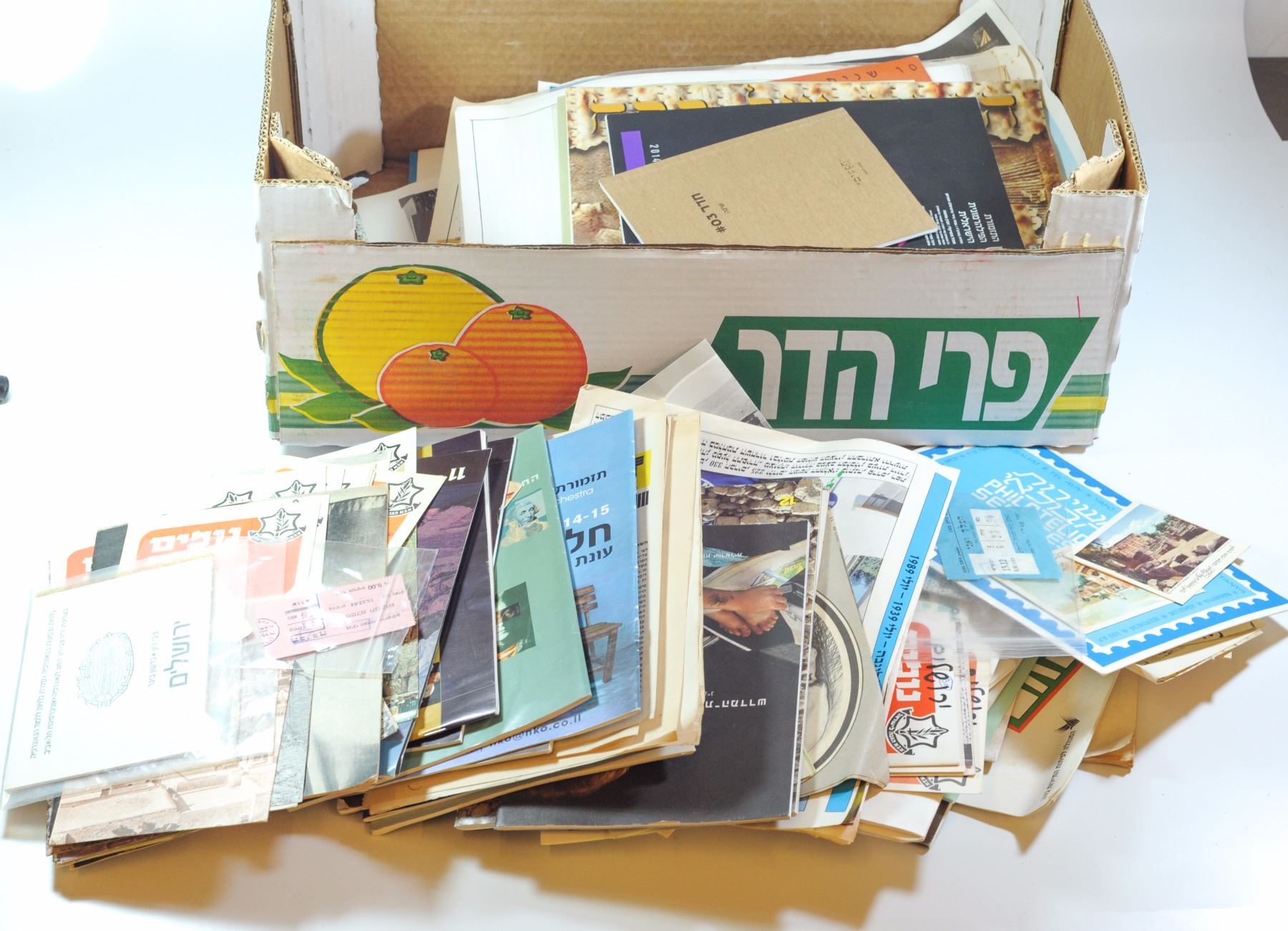 Collection of old documents - Israel, 1950s-1980s, includes postcards, maps, letters, different documents, booklets, books and more. Large cardboard box, dimensions: 49X30X20 cm.