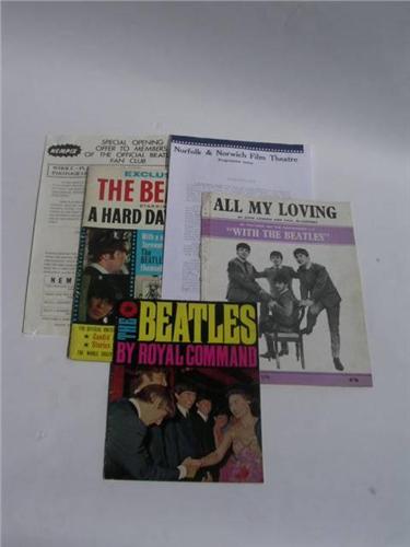 Collection of original Beatles Memorabilia inc Beatles by Royal Command 1963, All My Loving Sheet Music 1963, A Hard Day’s Night Souvenir Booklet 1964, large Nempix Beatles Fan Club Flyer 1964, A Hard Day’s Night Norfolk & Norwich Programme Notes (c’70’s)