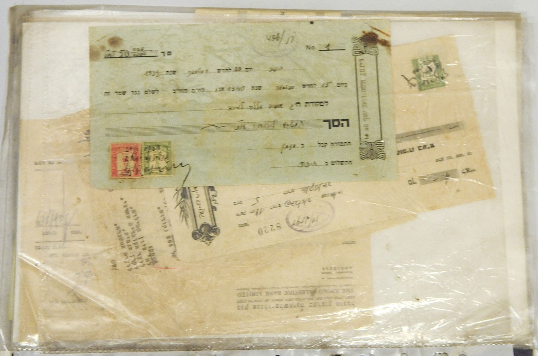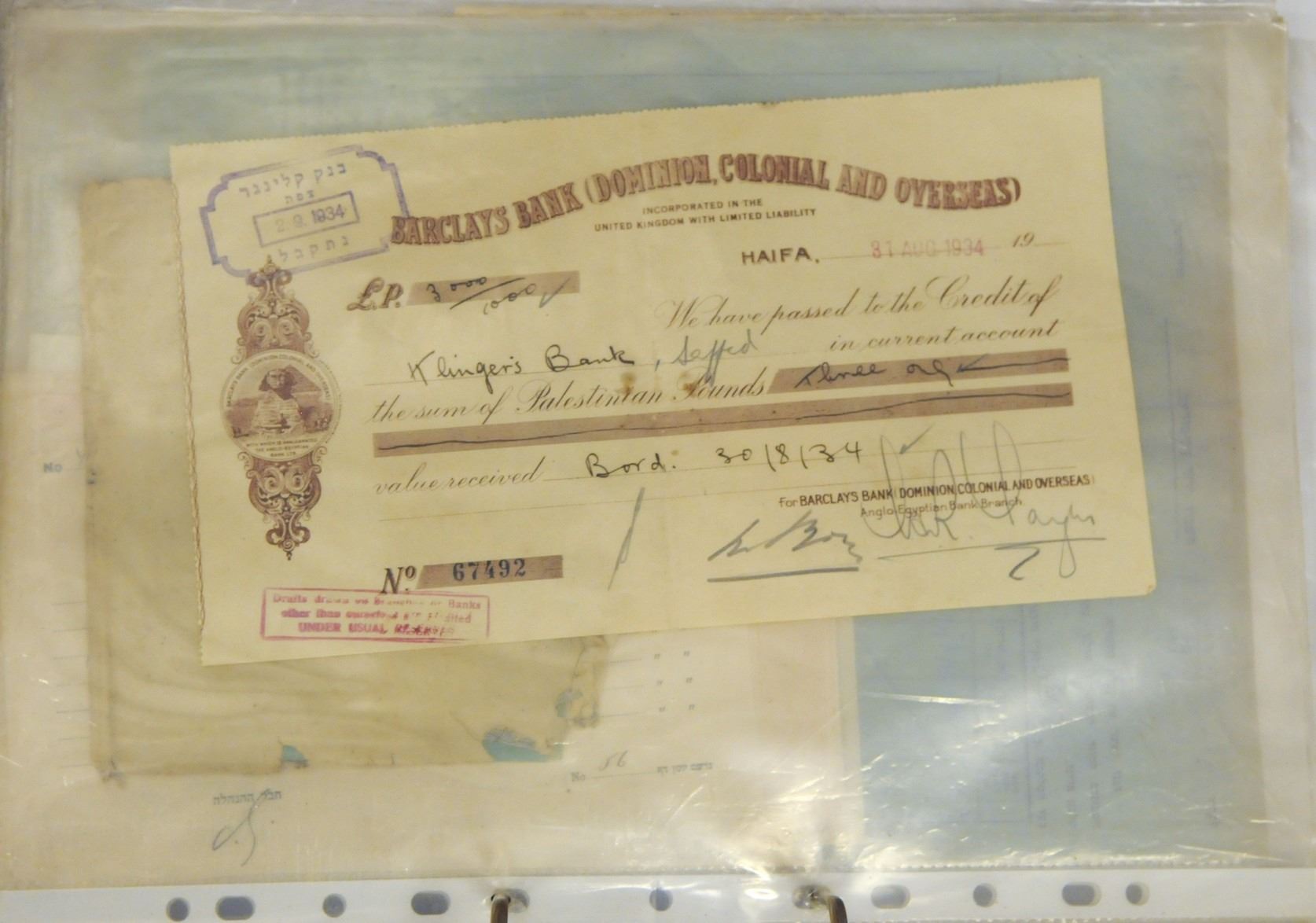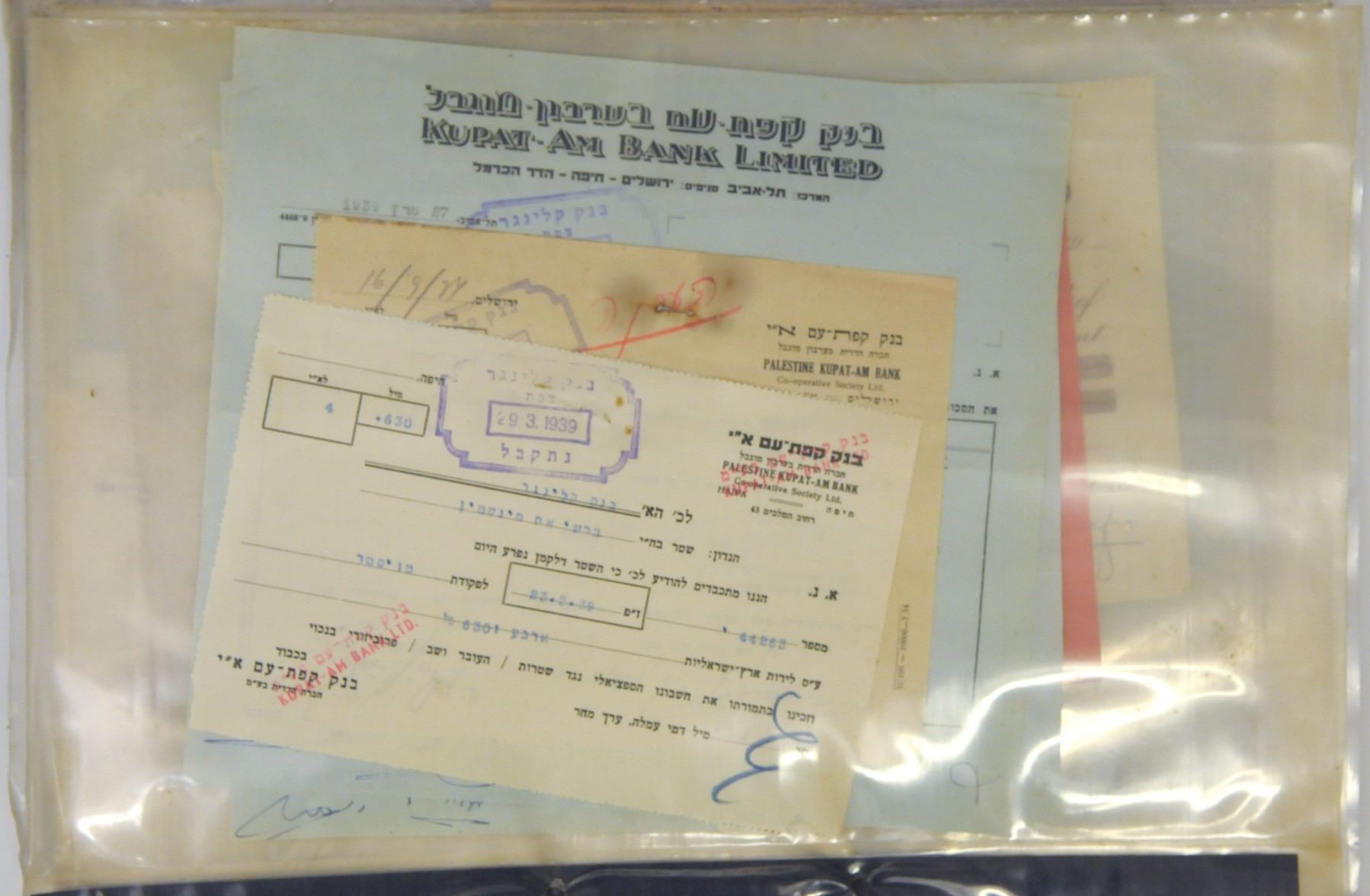 Collection of paper bank documents from Mandatory Palestine, 1930s-1940s, contains over 50 documents, receipts, checks and letters from banks in Eretz Israel, including the Anglo-Palestine Bank, Barzel et Klinger Safed, Ottoman Bank, Kefet Am and Mizrachi Bank.