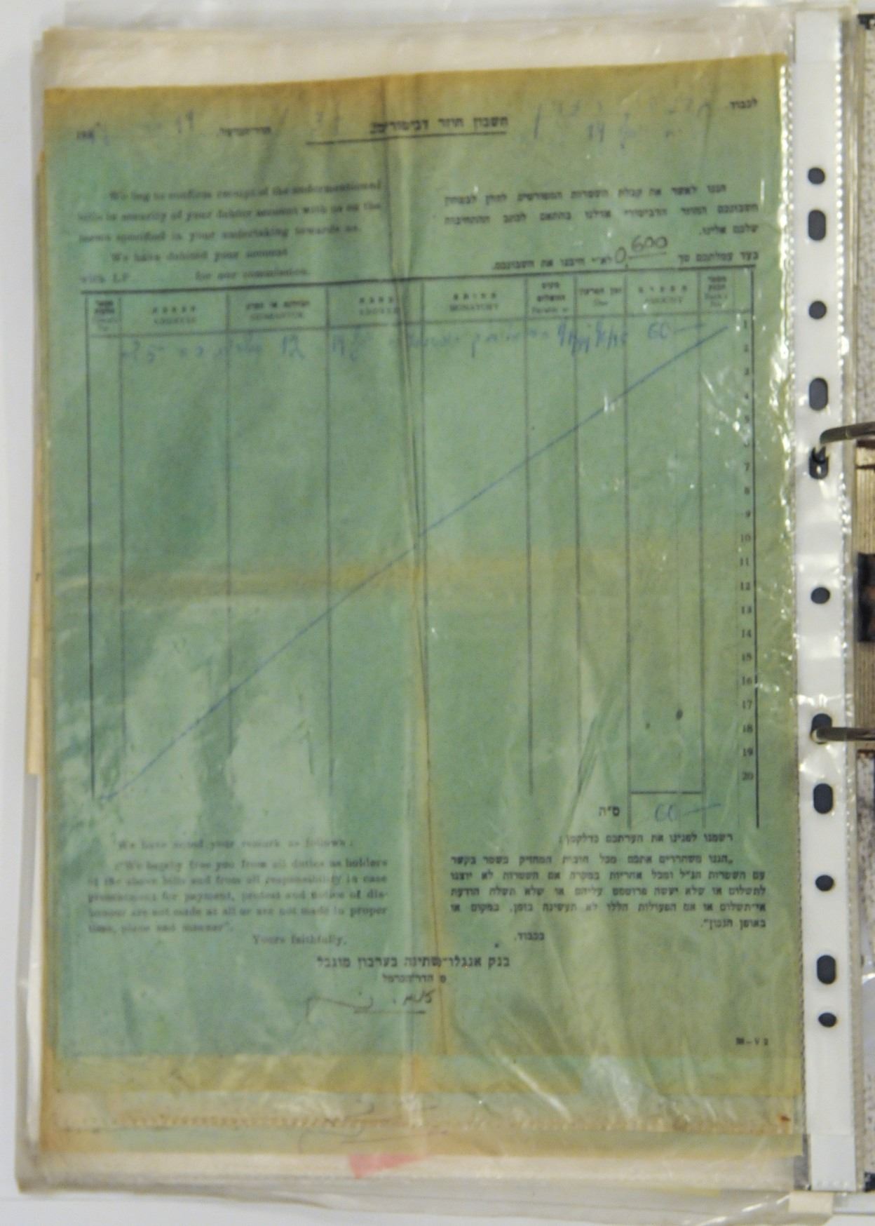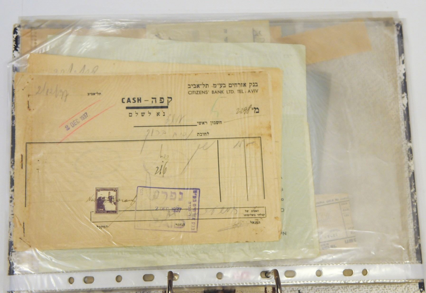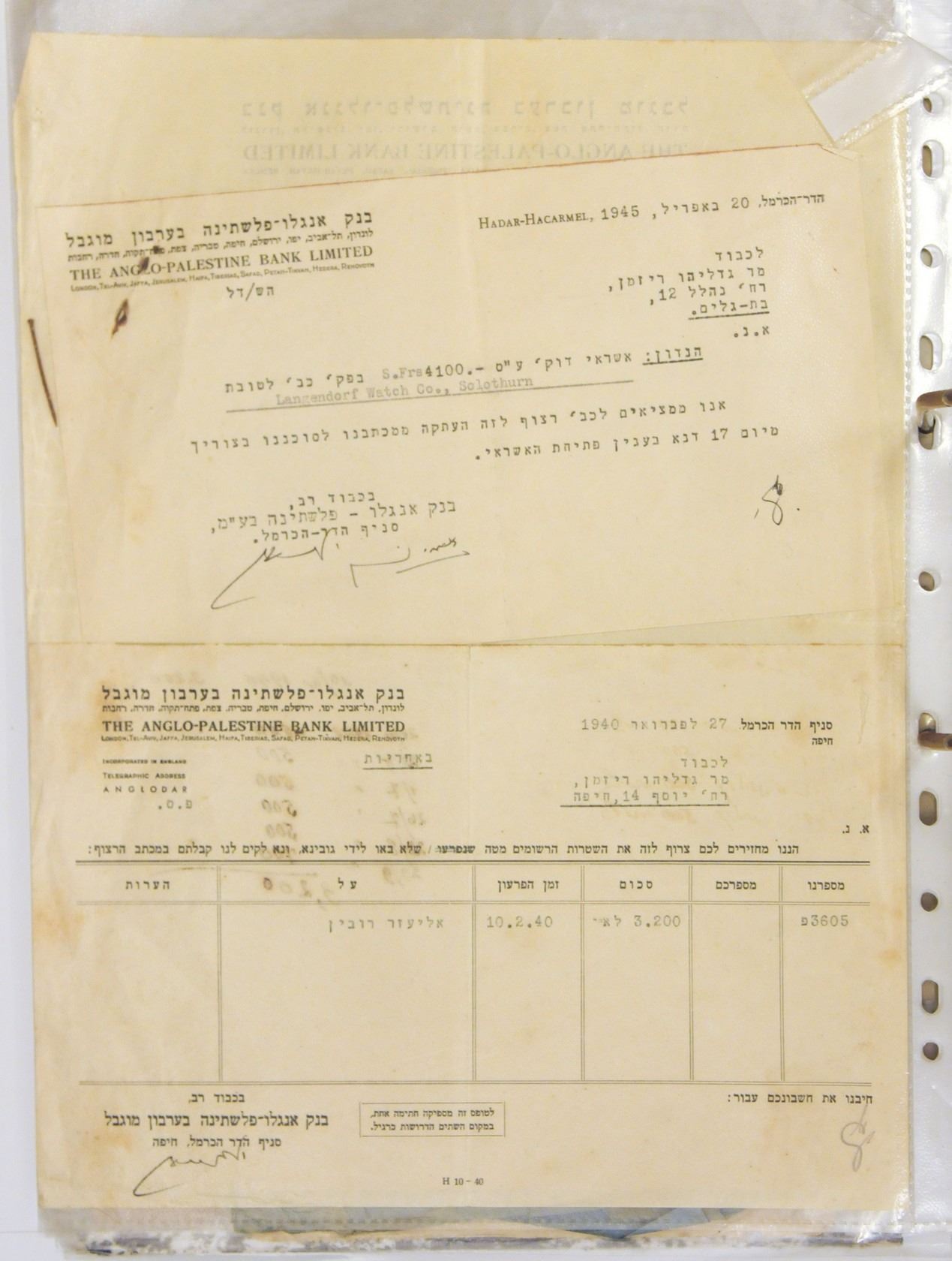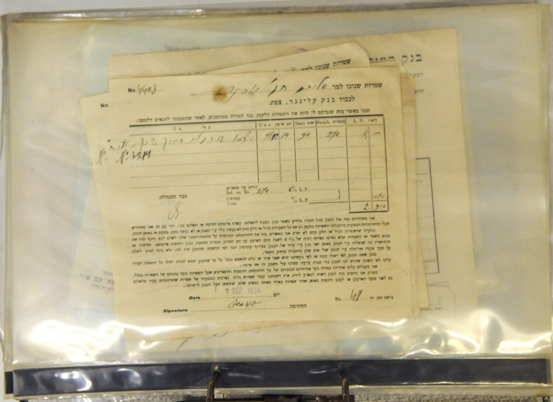 Collection of paper bank documents from Mandatory Palestine, 1930s-1940s, contains over 50 documents, receipts, checks and letters from banks in Eretz Israel, including the Anglo-Palestine Bank, Barzel et Klinger Safed, Ottoman Bank, Kefet Am and Mizrachi Bank.
