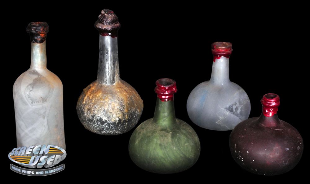 (Disney, 2006 & 2007) This is a collection of five prop rum bottles that were used as set dressing during filming. The bottles are made of glass, empty and are in very good condition.