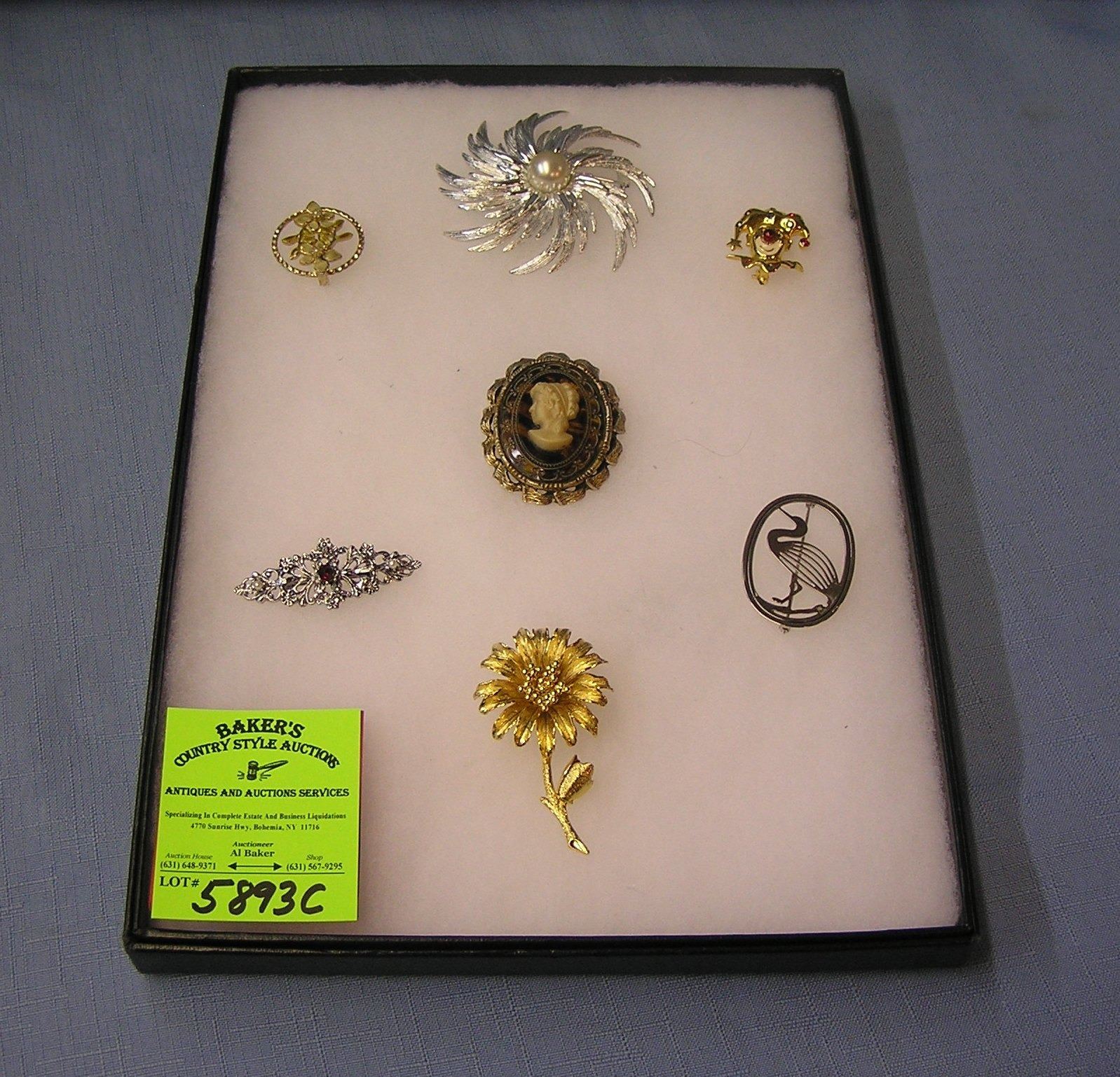 Collection of quality costume jewelry pins includes a cameo, a large Sara Coventry with pearl , a Gerry's and a signed stork pin est. value $75.00-$100.00
