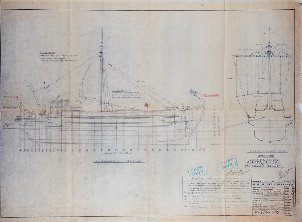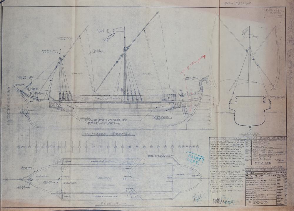 (MGM, 1959) Original MGM art department blueprints (7) detailing conversion of Pirates’ Galley ships into other versions to conserve prop construction, and for an effects miniature raft. Sizes range from 21 x 30” to 42 x 48”, and all are signed by art director Wm. Horning and visual effects supervisor Arnold Gillespie. Very Fine overall, with minor signs of age and handling.