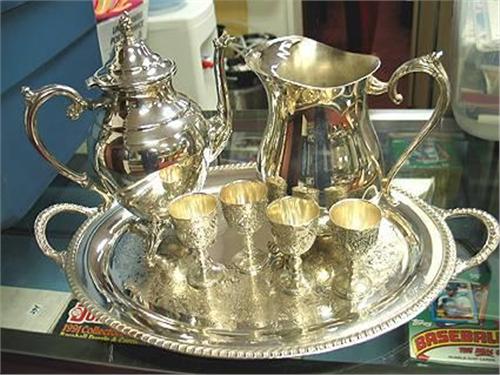 Collection of silverplate on an ornate tray. Includes a teapot, a water pitcher and ornate cordials