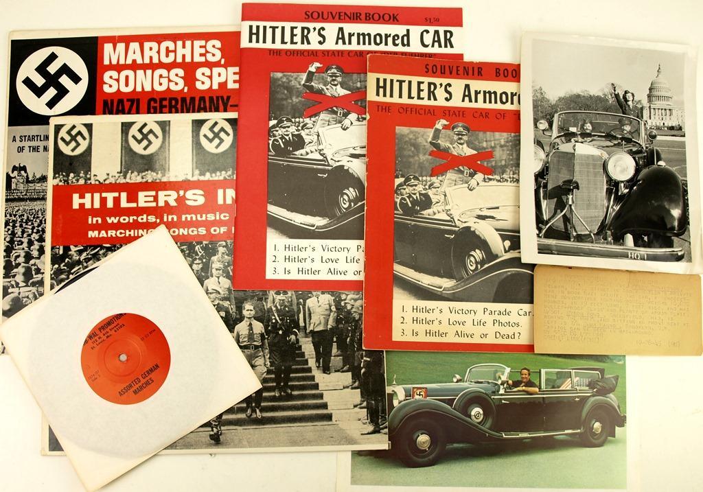 two "Hitler's Armored Car" booklets, one black and white photo of WAC Pvt. Peggy Donaldson standing in mock salute front of White House, three records.