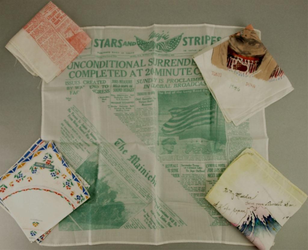 including two 1946 soldier signed, one of which is portrait, two surrender of Japan, two with floral pattern.